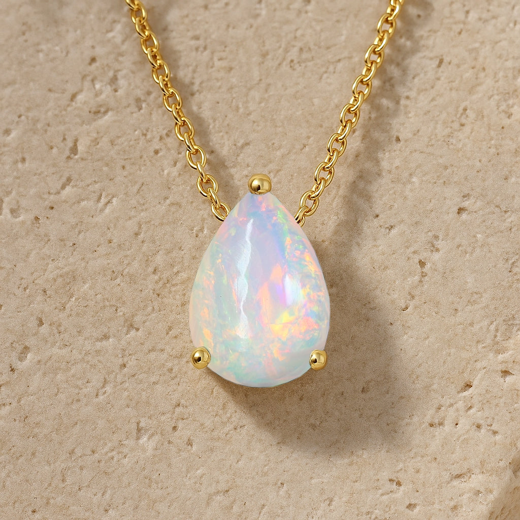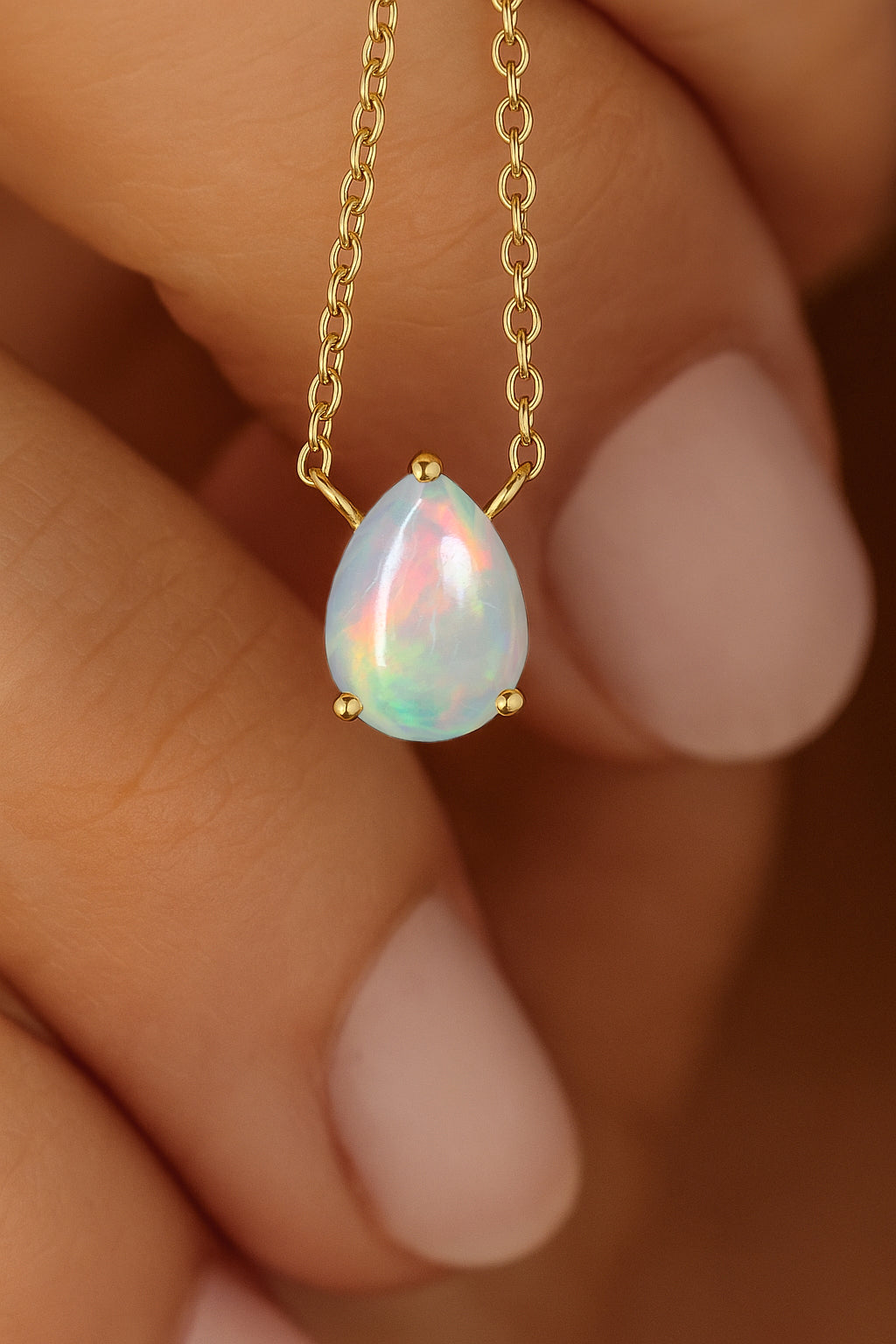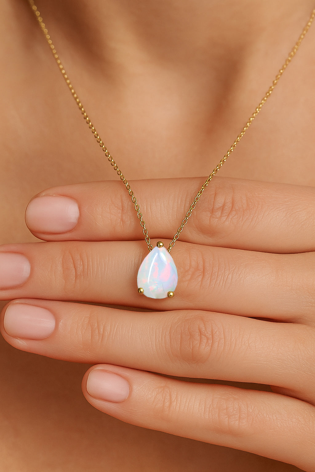 White OpalThis elegant White Opal Pear Stone Pendant Necklace beautifully crafted in 925 Sterling Silver. Featuring a smooth 8x6 mm pear-shaped opal weighing 0.9 carat, it radiates soft shimmer and timeless charm. The pendant measures 8.61x6.30 mm and hangs gracefully on a 16"+2" cable chain secured with a lobster clasp. Lightweight at approx. 0.80 gm, it offers a delicate yet striking touch perfect for gifting or daily wear.