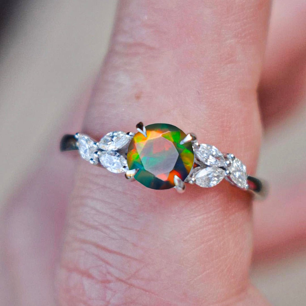 Black OpalNatural Black Opal 925 Sterling Silver Statement Ring, beautifully crafted for women who appreciate unique and meaningful jewelry. This captivating ring features a 6 mm round natural black opal (0.8 carat), known for its vibrant play of colors that change beautifully with every movement. Each gemstone is one-of-a-kind, ensuring your ring is as unique as the person wearing it. Expertly handmade with 925 sterling silver, this piece merges durability with sophisticated style. The smooth band offers exceptional comfort, making it perfect for everyday elegance or special occasions.