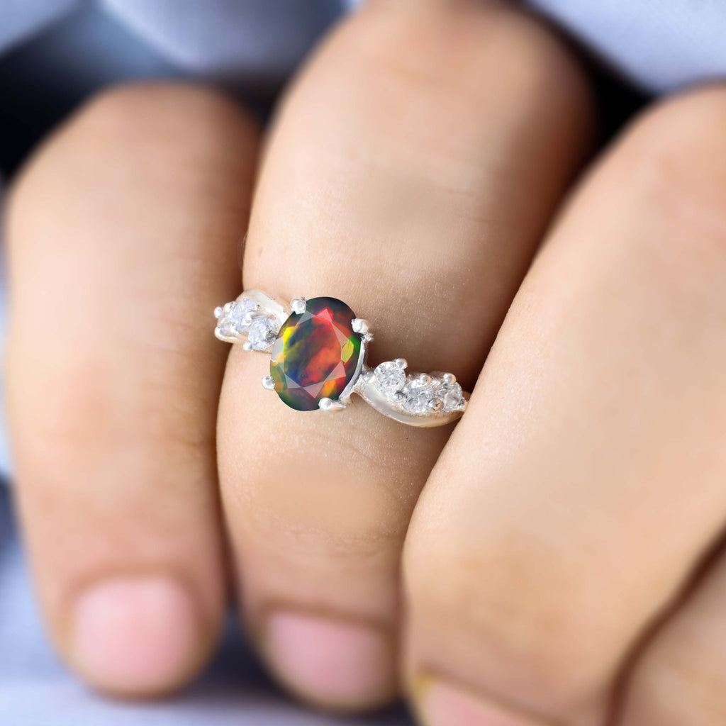 This captivating piece features a genuine 8x6mm oval-shaped natural black opal, weighing approximately 0.9 carats, known for its mesmerizing play-of-color that flashes vibrant blues, greens, and reds. Each gemstone is unique, offering one-of-a-kind beauty and charm. The design is inspired by graceful ocean waves, symbolizing strength and movement. The wave-style setting enhances the opal's brilliance while adding a modern, sculptural aesthetic, perfect for women who appreciate distinctive, artistic jewelry. Whether you're dressing up for a formal event or adding a touch of luxury to your everyday look, this ring makes a stunning statement. Crafted with care from hypoallergenic 925 sterling silver, this ring offers lasting durability and a luxurious finish. It's ideal for long-term wear, combining elegance with everyday comfort.