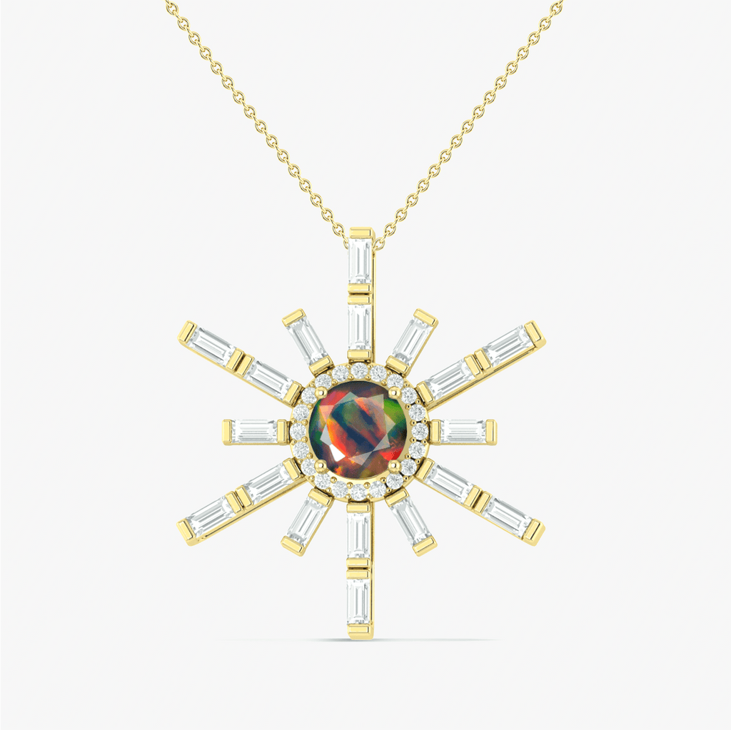 Black OpalGOODSTONE JEWELS Natural Opal Sun Charm Pendant Necklace. This exquisite piece features a stunning sun charm adorned with vibrant natural gemstones opal in 925 sterling silver with a luxurious yellow gold-filled finish. It’s the perfect blend of elegance and celestial inspiration, designed to complement any outfit. The necklace is not just beautiful but also versatile, offering an adjustable 16-inch cable chain with a 2-inch extender. This ensures a perfect fit for a variety of necklines and allows for layering with other jewelry pieces. Whether you're dressing up for a special occasion or adding a touch of sparkle to your daily attire, this necklace will enhance your look.