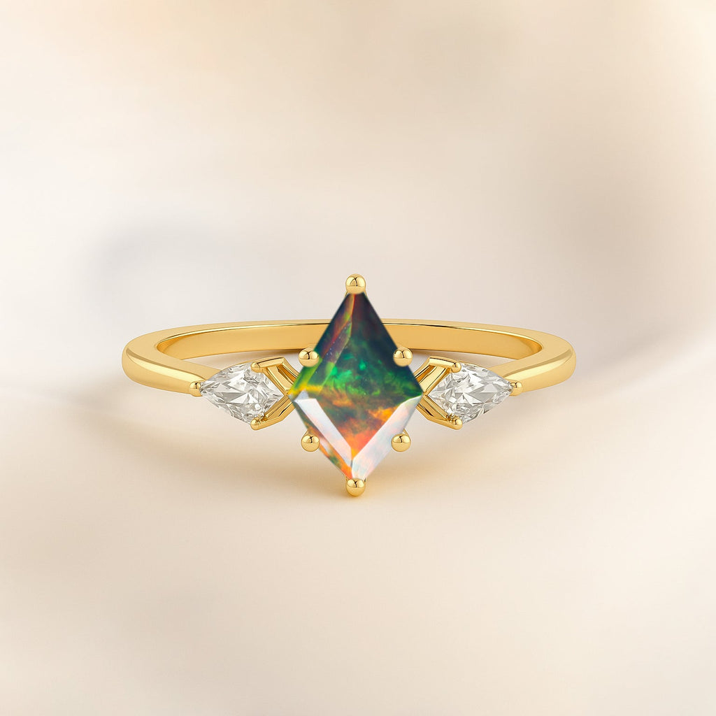 Black OpalThis Sterling Silver Black Opal Ring brings together mystique, romance, and everyday elegance in one striking design. Centered with an 8x6mm kite-shaped natural Black Opal, this ring showcases a stunning play-of-color, with deep, iridescent tones that shift beautifully in the light. Two 5x3mm kite-cut White Cubic Zirconia stones sit on either side of the opal in a classic three-stone arrangement, symbolizing the past, present, and future—making it a meaningful choice for engagements, anniversaries, or milestone celebrations. Crafted in genuine 925 Sterling Silver with luxurious Yellow Gold Plating, this ring offers both durability and a rich, warm finish that complements the vivid hues of the Black Opal. Weighing approximately 2.20 grams, it feels lightweight and comfortable on the finger, ideal for all-day wear without sacrificing impact or style. The faceted cuts of each stone enhance brilliance and detail, while the unique kite shapes create a modern, standout silhouette that sets this Sterling Silver Black Opal Ring apart from traditional designs. Whether worn as a statement piece, a romantic promise ring, or a special gift, this three-stone Black Opal ring adds a bold yet elegant touch to any jewelry collection and pairs beautifully with both casual and formal outfits.