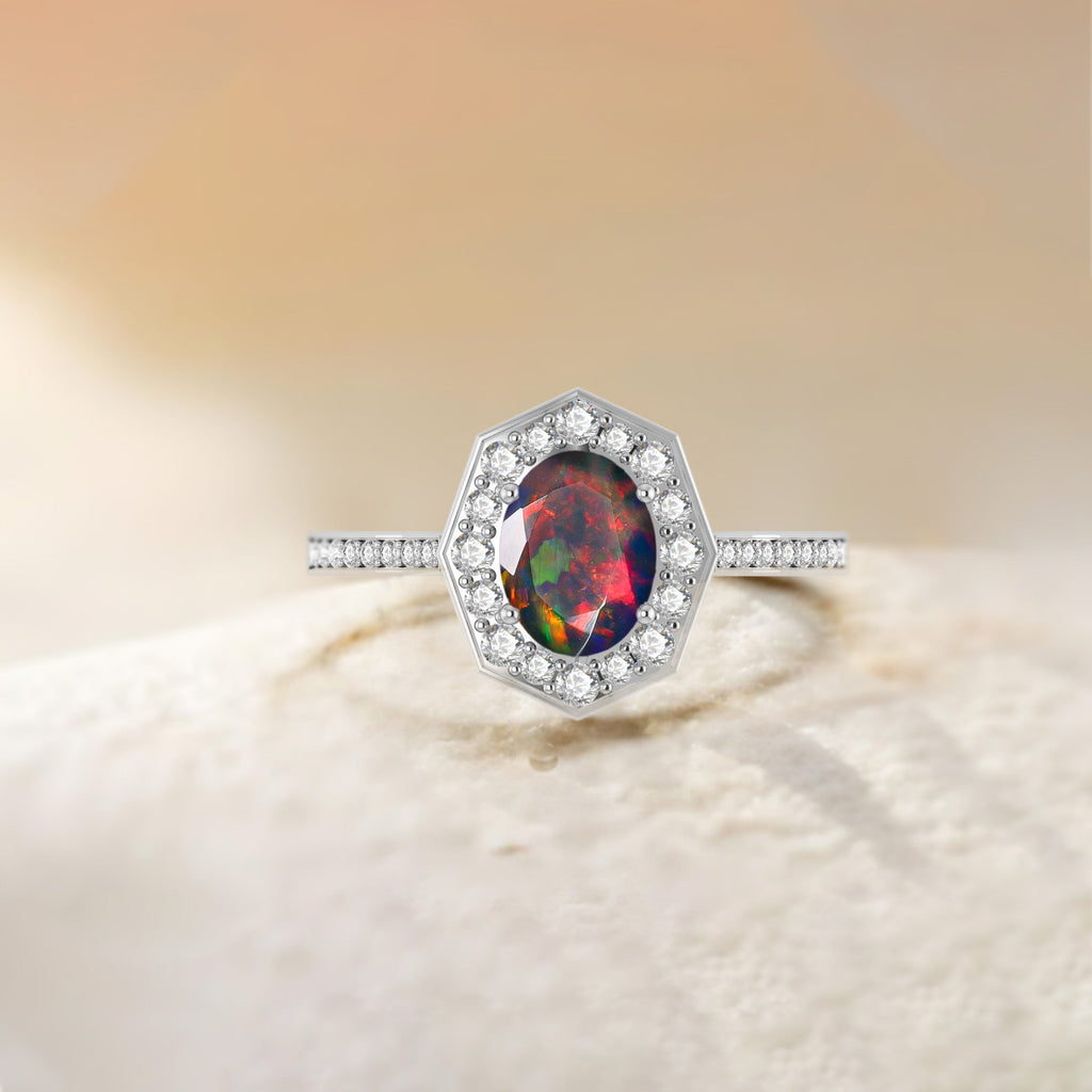 Black OpalNatural Black Opal 925 Sterling Silver Engagement Halo Ring for Women. This exquisite piece features a mesmerizing 8x6mm oval-shaped black opal (1.0 carat), renowned for its vibrant play-of-color and timeless beauty. Set in solid 925 sterling silver, this ring brings sophistication to any jewelry collection. Designed in a bold octagon-style setting, the ring boasts a face size of approximately 13.73mm and a weight of 4.30 grams, striking enough to make a Engagement Halo, yet comfortable enough for daily wear. Whether you're dressing up for a formal occasion or adding sparkle to your everyday outfit, this ring is sure to impress. This piece makes an unforgettable gift for your wife, girlfriend, or mother, perfect for anniversaries, birthdays, weddings, or engagements.