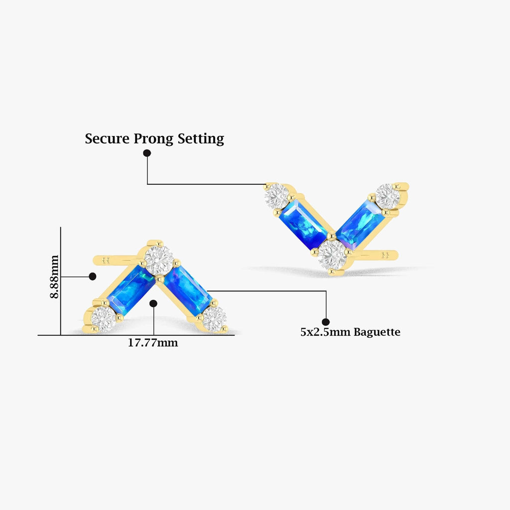 Blue OpalGOODSTONE JEWELS' 925 Sterling Silver Stud Earrings. Handcrafted with exquisite detail, these luxurious earrings feature natural opal baguette-cut gemstones, delicately set in durable sterling silver for a refined, high-end look. Inspired by the power of birthstones and the elegance of fine design, each earring sparkles with vibrant color and natural brilliance, making them a perfect gift for mothers, wives, girlfriends or a special treat for yourself. Whether you're celebrating a birthday, anniversary, or just want to express love and appreciation, these earrings deliver a meaningful and stylish statement. Measuring 13.80 x 8.90 mm and weighing just 3 grams, these earrings are lightweight enough for daily wear, while the secure push-back closure ensures a comfortable and reliable fit. Their unique 2.5 x 5 mm baguette-cut gemstones and 1 carat face make them stand out as a dazzling yet sophisticated accessory.