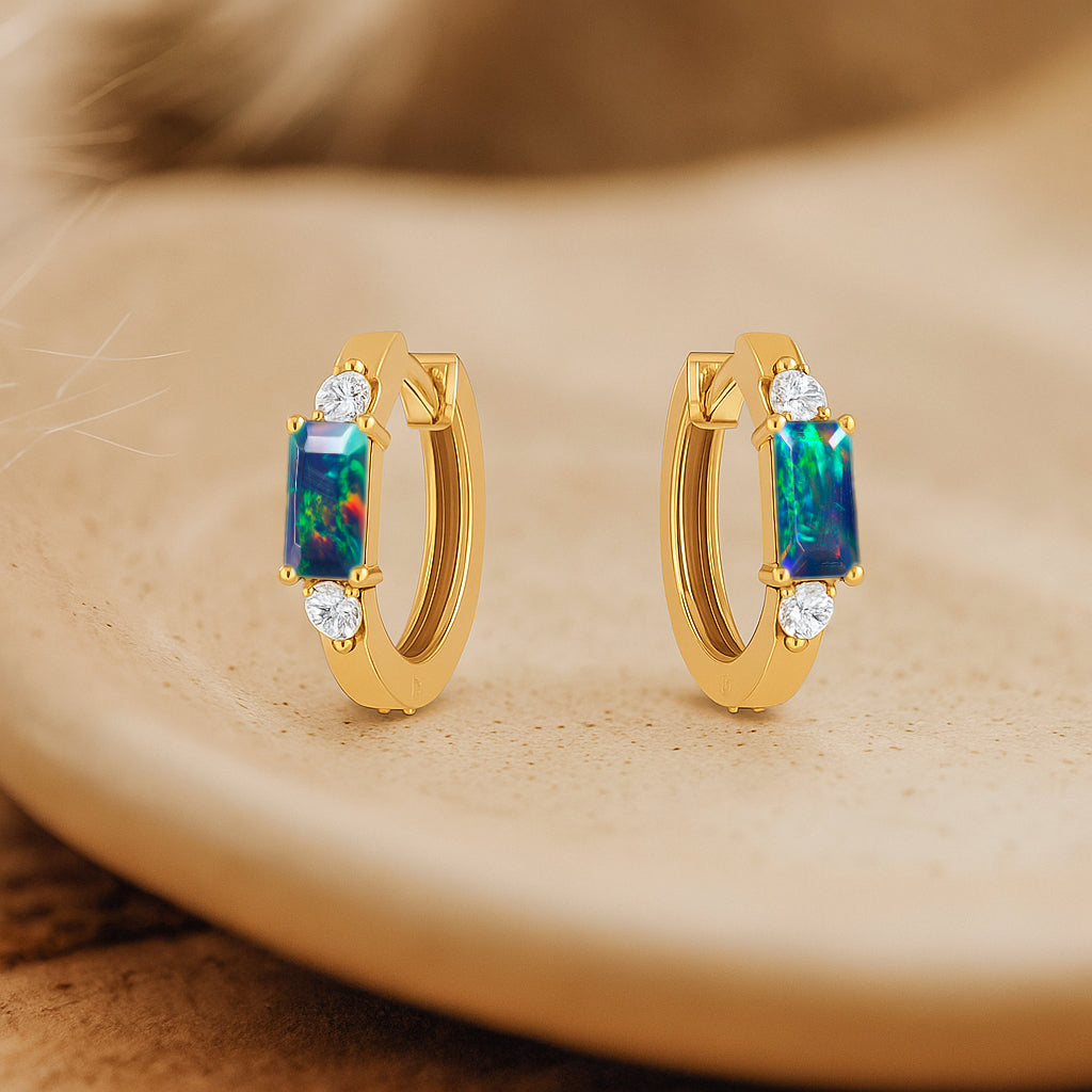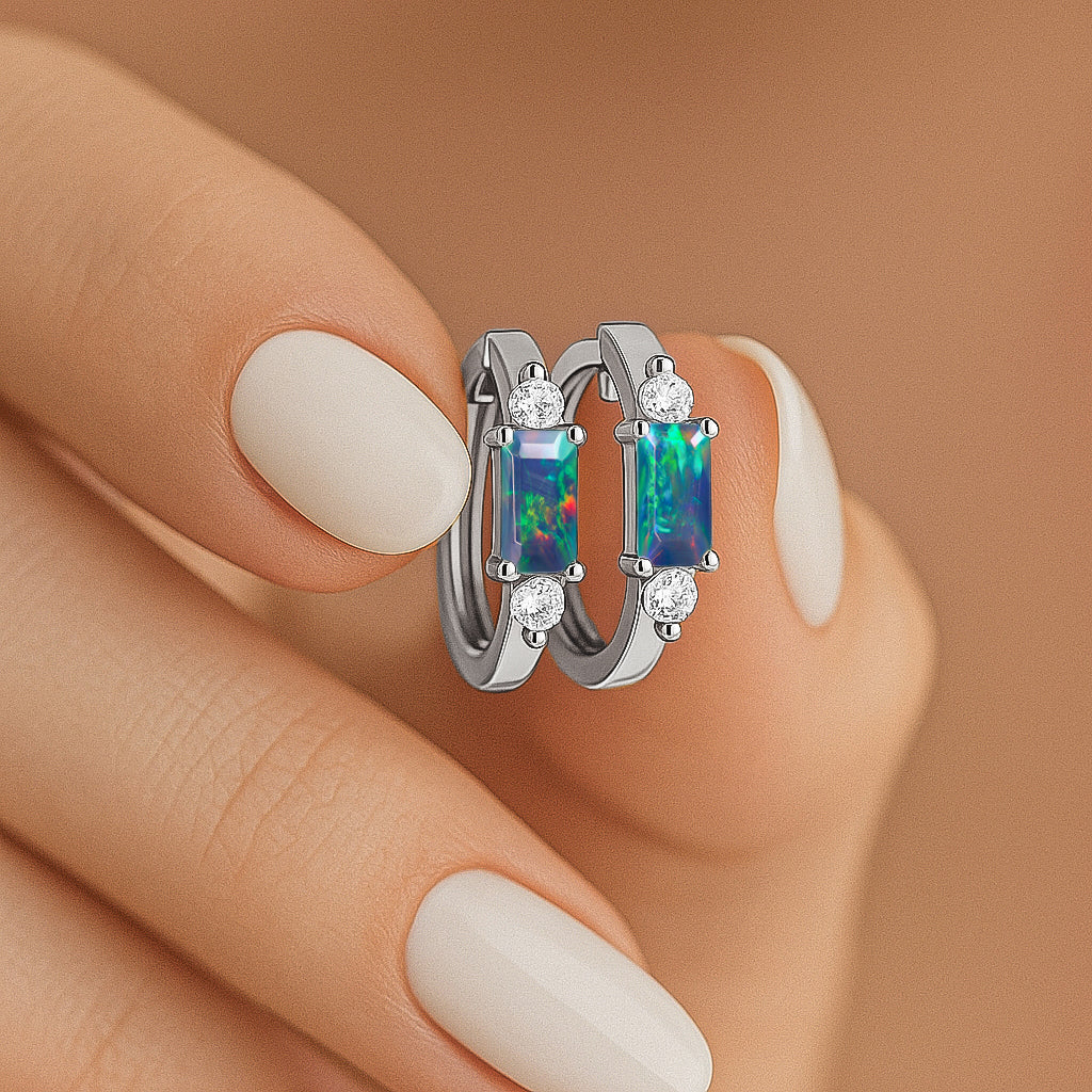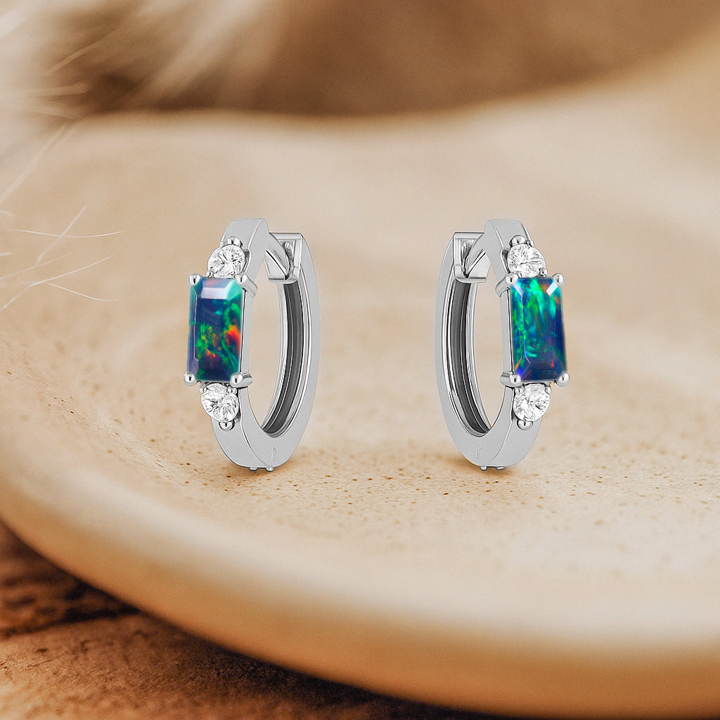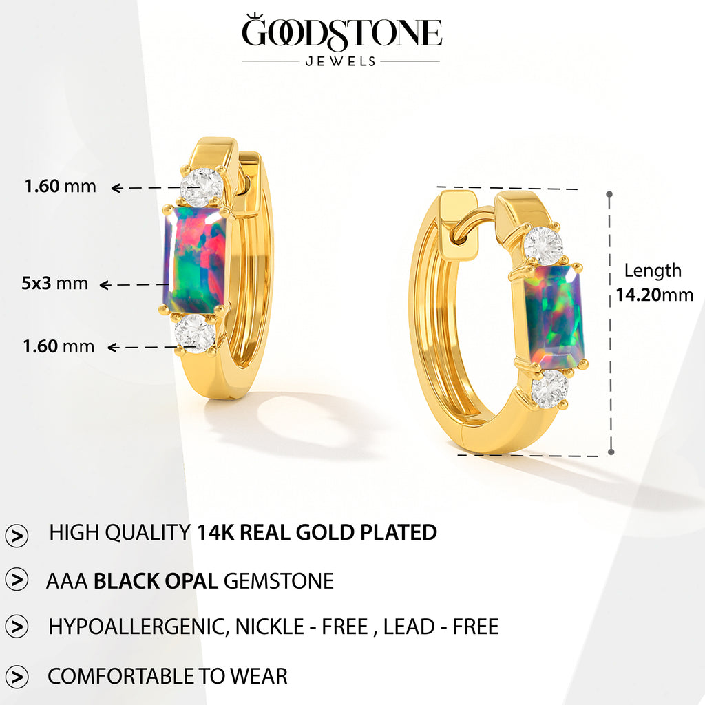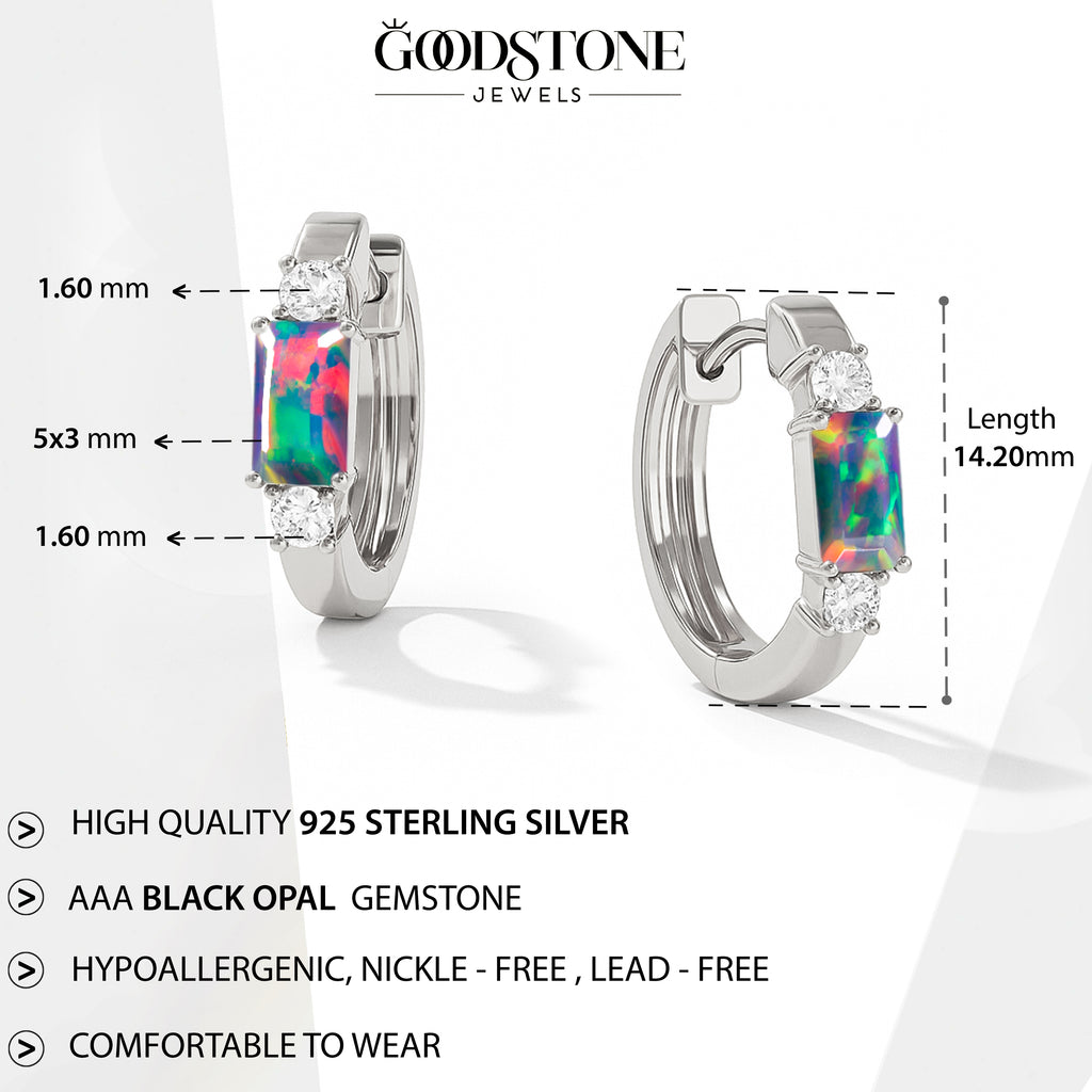 Black OpalElevate your style with these elegant Baguette Stone Hoop Earrings, crafted in premium 925 Sterling Silver. Each earring features natural black opal baguette stones measuring 5x3 mm, offering a vibrant pop of color and refined sparkle. The hoops measure 14.20×10.00 mm and weigh 2.95 g, making them lightweight yet luxurious for all-day wear. With a total gemstone weight of 0.80 carat, these black opal hoops bring timeless charm and a sophisticated finish to any jewelry collection.