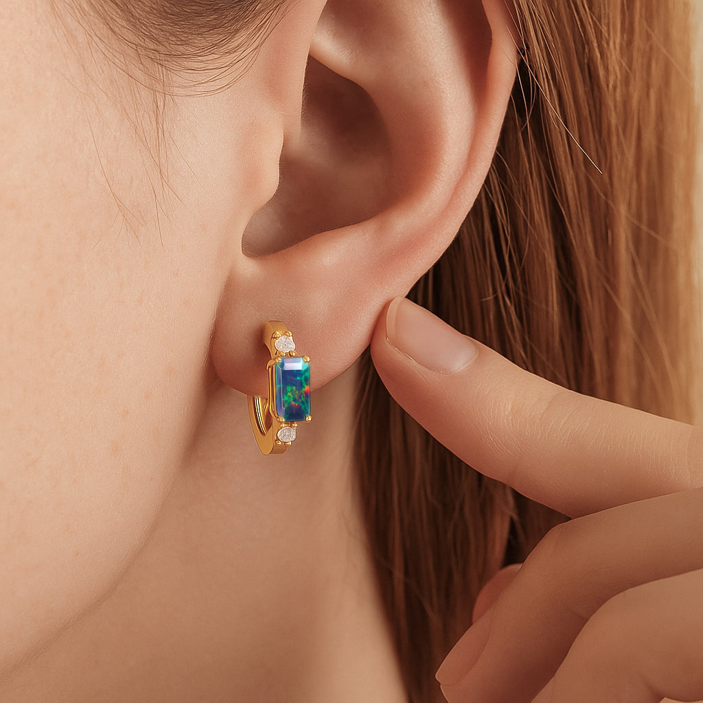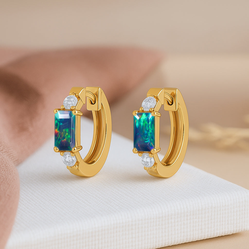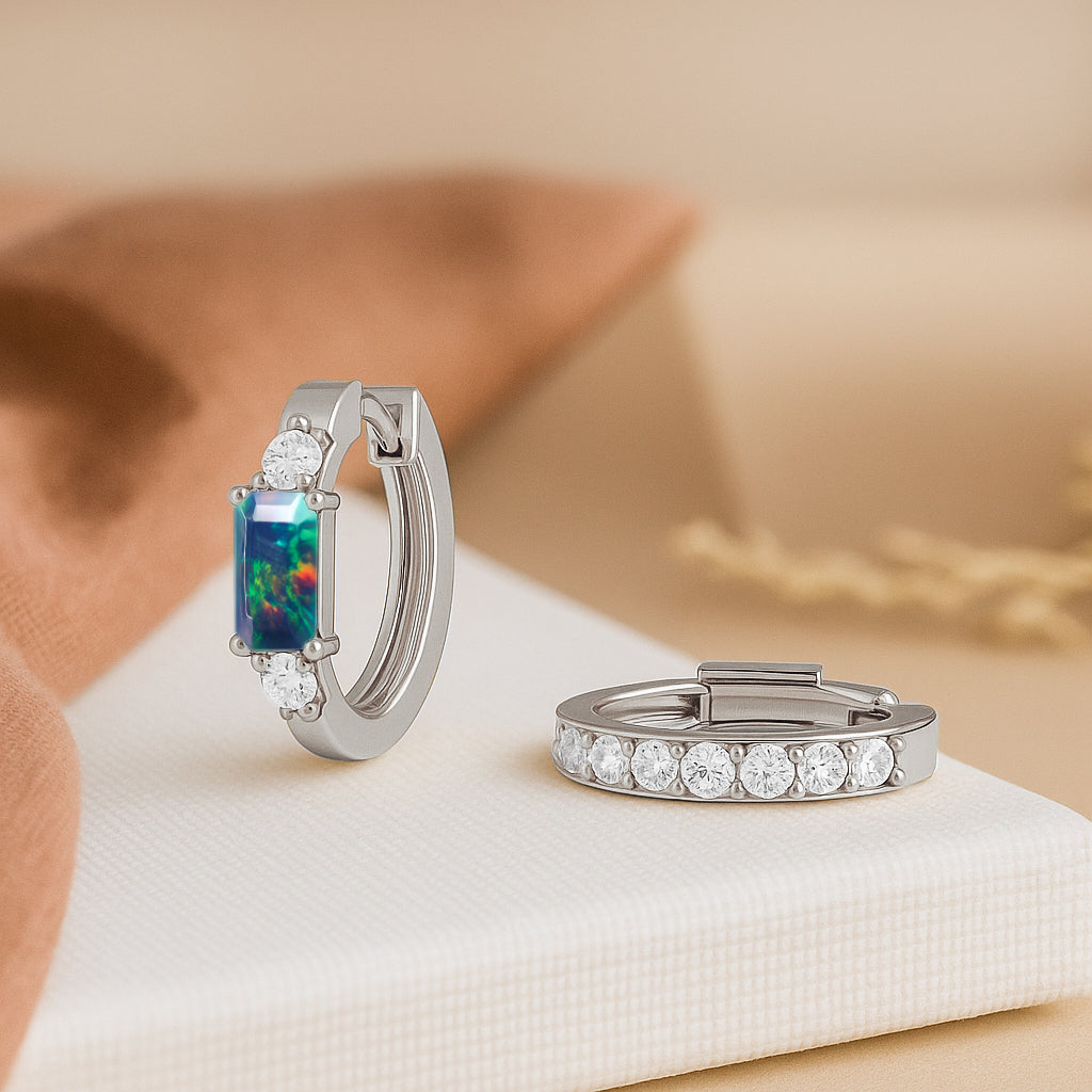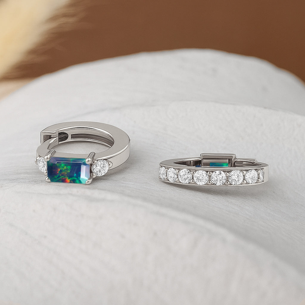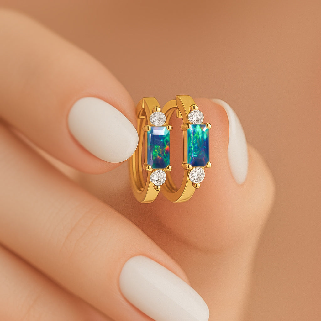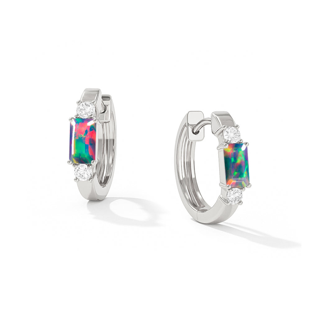 Black OpalElevate your style with these elegant Baguette Stone Hoop Earrings, crafted in premium 925 Sterling Silver. Each earring features natural black opal baguette stones measuring 5x3 mm, offering a vibrant pop of color and refined sparkle. The hoops measure 14.20×10.00 mm and weigh 2.95 g, making them lightweight yet luxurious for all-day wear. With a total gemstone weight of 0.80 carat, these black opal hoops bring timeless charm and a sophisticated finish to any jewelry collection.