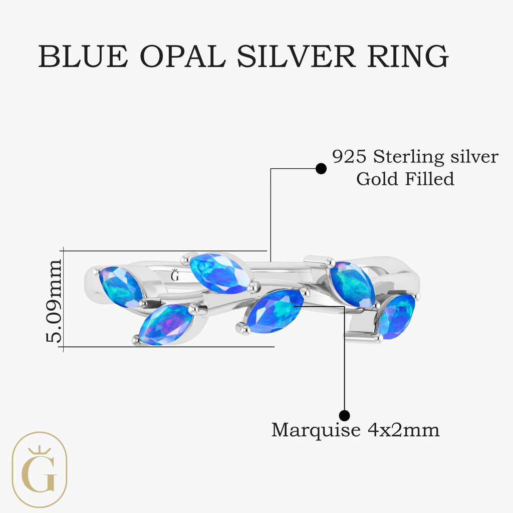 Blue OpalNatural Blue Opal 925 Sterling Silver Leaf Ring for Women, designed to captivate with every detail. Featuring six marquise-cut 4x2 mm genuine Blue opals totaling 1.5 carats, this stunning piece is a perfect balance of natural beauty and sophisticated craftsmanship. Each stone reveals mesmerizing flashes of fire, making it a truly one-of-a-kind treasure. Crafted from premium 925 sterling silver and luxuriously plated with yellow gold, this ring offers both durability and refined charm. It's hypoallergenic and nickel-free composition ensures long-lasting comfort, making it perfect for daily wear or special occasions. The nature-inspired leaf design symbolizes growth, renewal, and femininity, creating a piece that not only dazzles but carries deep meaning.
