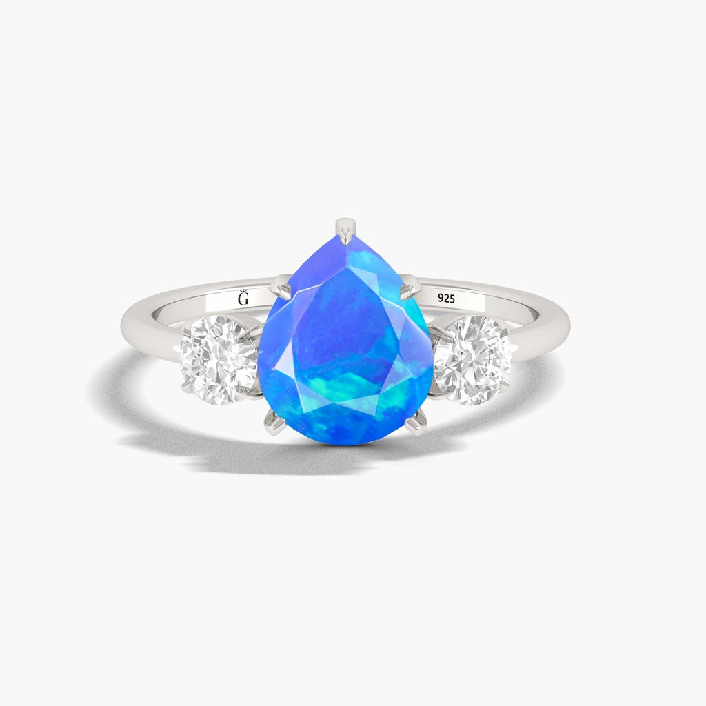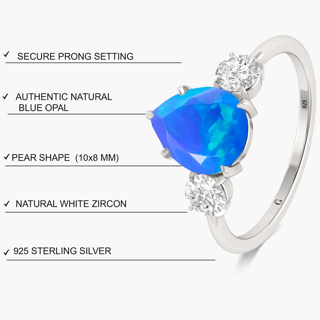 Blue OpalNatural Blue Opal Three Stone Statement Ring featuring a mesmerizing 10x8 mm pear-faceted natural Blue opal weighing 1.6 carats. This ring captures light and color with every movement. Handcrafted in hypoallergenic 925 sterling silver and finished in radiant yellow gold filled, it's designed to be both striking and comfortable for daily wear. This piece isn’t just beautiful, it’s meaningful. Whether you're celebrating an anniversary, engagement, birthday, or special promise, this birthstone jewelry ring makes a heartfelt gift for the woman you love. The unique pear shape and vibrant play of color make it a true three-stone Statement ring for women, blending bold style with feminine elegance.