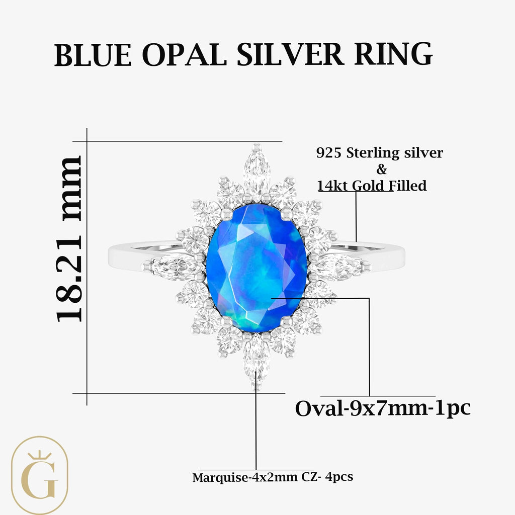 Blue OpalNatural Blue Opal 925 Sterling Silver Halo Ring, beautifully finished in radiant yellow gold plating. Featuring a vibrant 9x7 mm oval-cut natural Blue opal, this ring captivates with its fiery color play and unique charm, making it the perfect Halo piece for any special occasion or everyday luxury. Crafted with premium 925 sterling silver, the band is hypoallergenic and built to last, offering both durability and refined beauty. The yellow gold-filled finish adds a luxurious glow that complements the bold opal centerpiece, creating a sophisticated accessory that stands out. Whether you're celebrating an anniversary, birthday, wedding, or Valentine’s Day, this exquisite Blue opal ring makes an unforgettable gift for the woman you love. It's 1.0 carat weight and elegant design reflect both sentiment and style, making it a treasured keepsake she’ll cherish forever.