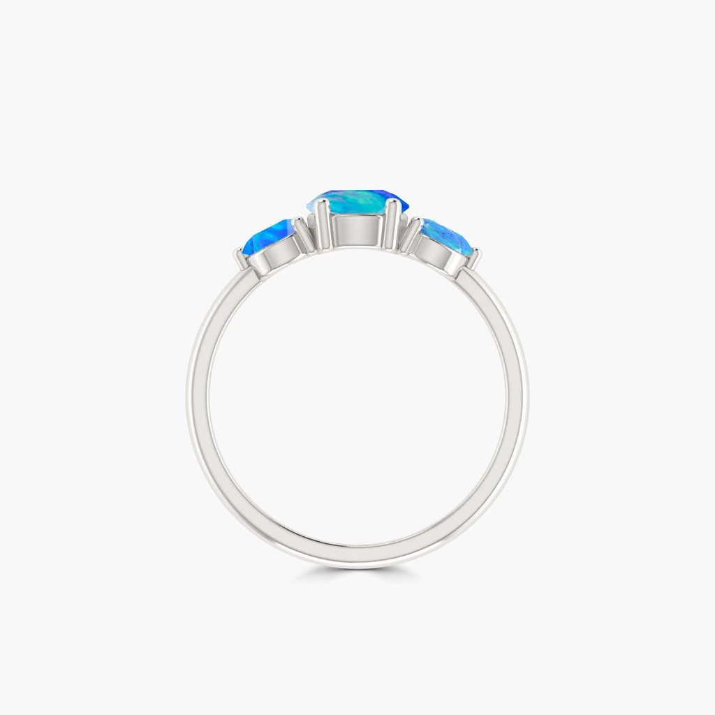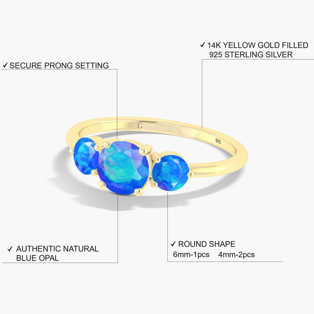 Blue OpalNatural Blue Opal 3-Stone Engagement Ring, beautifully crafted in 925 Sterling Silver and yellow gold filled for a luxurious yet durable finish. This timeless piece features a dazzling 6mm round Blue opal center stone, flanked by two sparkling 4mm round accent opals, totaling 1.5 carats of radiant brilliance. The three-stone design symbolizes your past, present, and future, making it a perfect choice for engagements, anniversaries, weddings, or as a promise ring for her. Set in high-quality hypoallergenic sterling silver, the ring is both elegant and comfortable for everyday wear.
