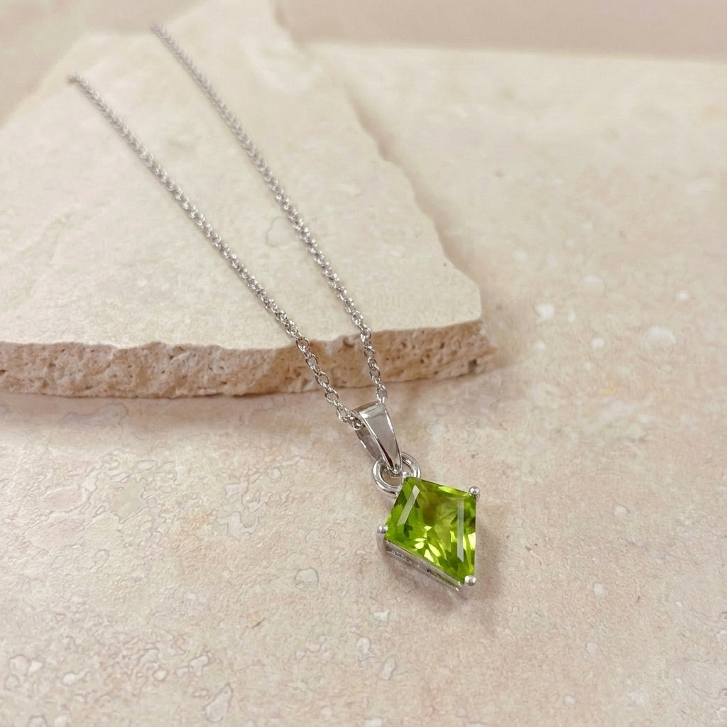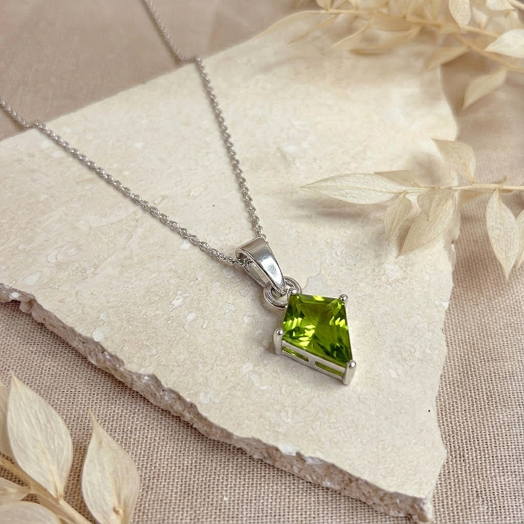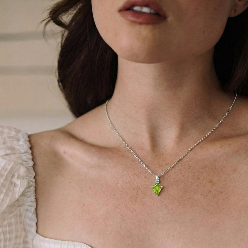 Natural Peridot Kite Solitaire Pendant Necklace in 925 Sterling Silver 1.4ct features a vibrant 9x7mm kite-shaped faceted peridot with bright green hues. The pendant measures 18.20 x 7.40mm and is suspended from a 16” + 2” adjustable cable chain with a secure lobster clasp. Crafted from premium sterling silver and weighing 3.7 grams with the chain, this elegant necklace offers timeless beauty, refreshing color, and everyday comfort—perfect for gifting or adding a lively pop of color to any jewelry collection.