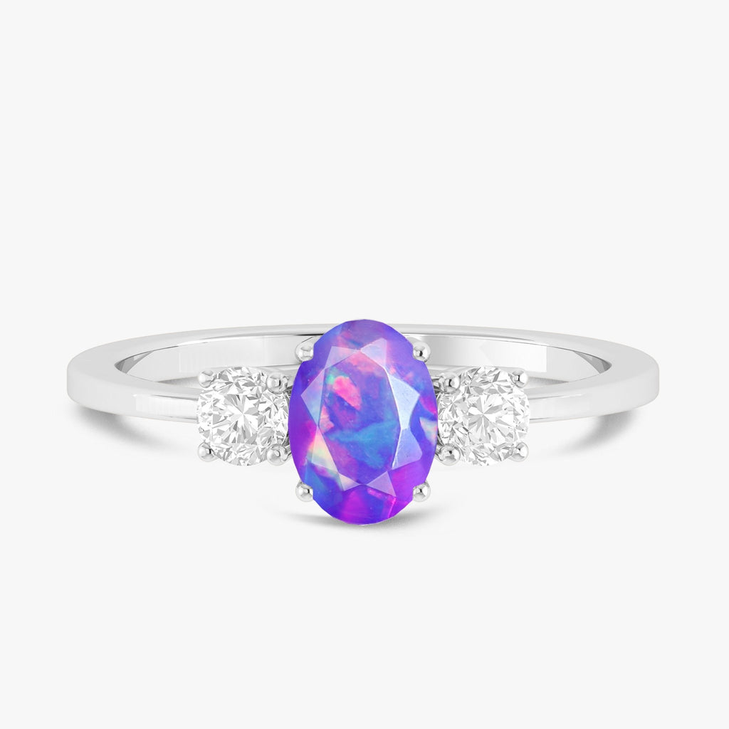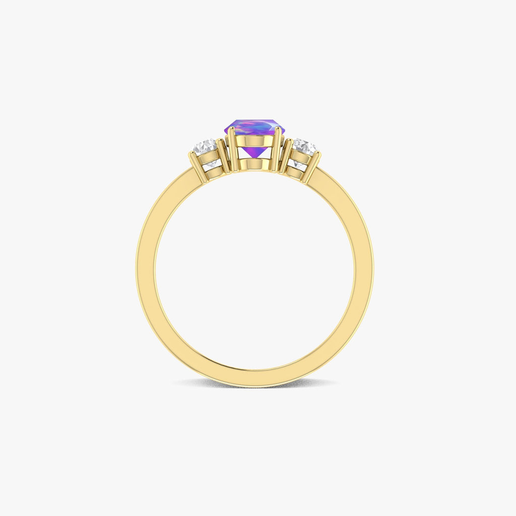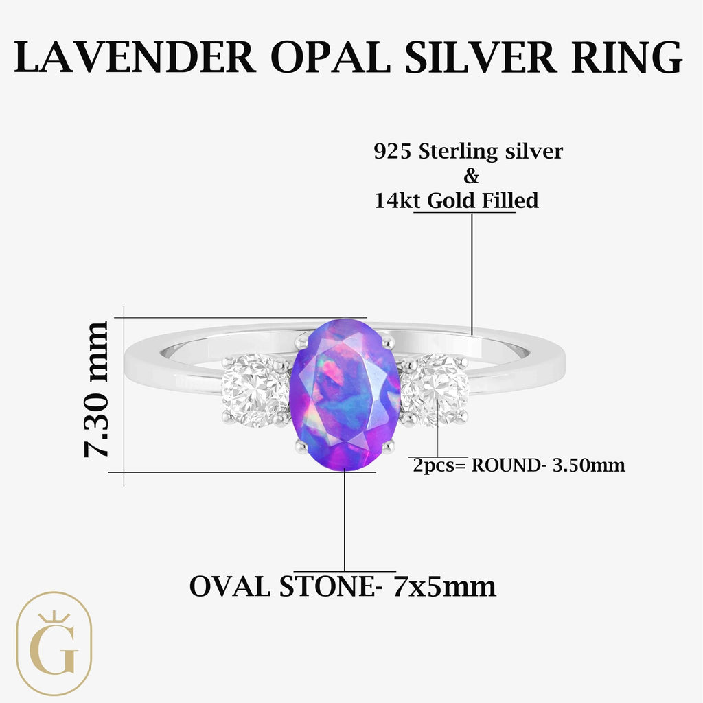 Lavender OpalNatural Lavender Opal Three Stone Ring, expertly crafted for the woman who appreciates elegance with a touch of mystery. Featuring a genuine 7x5 mm oval Lavender Opal (0.6 carat), this exquisite gemstone showcases mesmerizing flashes of color that shift with the light making every glance a moment of awe. Set in high-quality 925 sterling silver and finished with a lustrous layer of yellow gold, this ring offers both luxury and durability. Its hypoallergenic and tarnish-resistant design ensures long-lasting shine and comfort, perfect for daily wear or those once-in-a-lifetime occasions. Whether you're celebrating an anniversary, wedding, or simply want to surprise someone special, this ring makes a heartfelt gift for your wife, girlfriend, or mother.