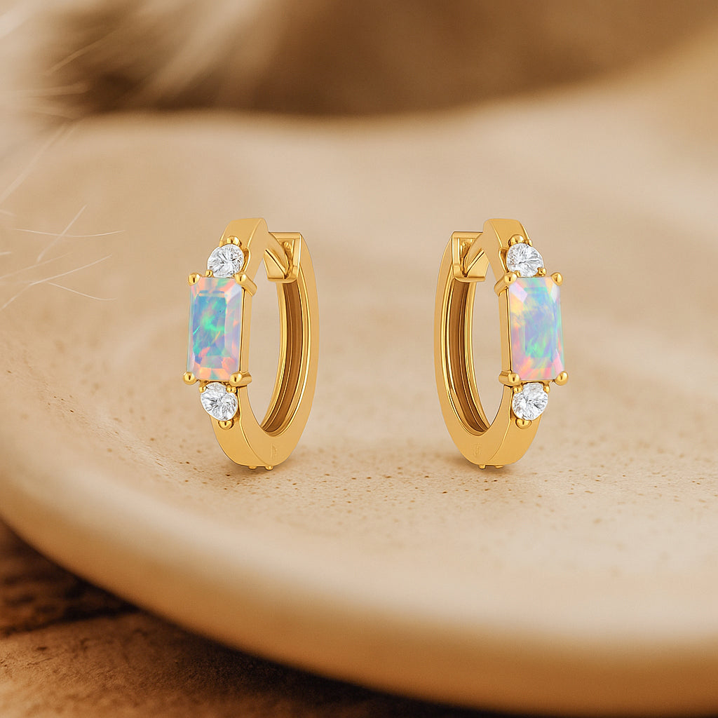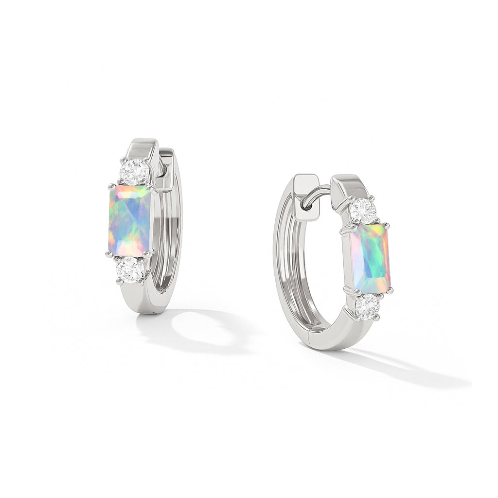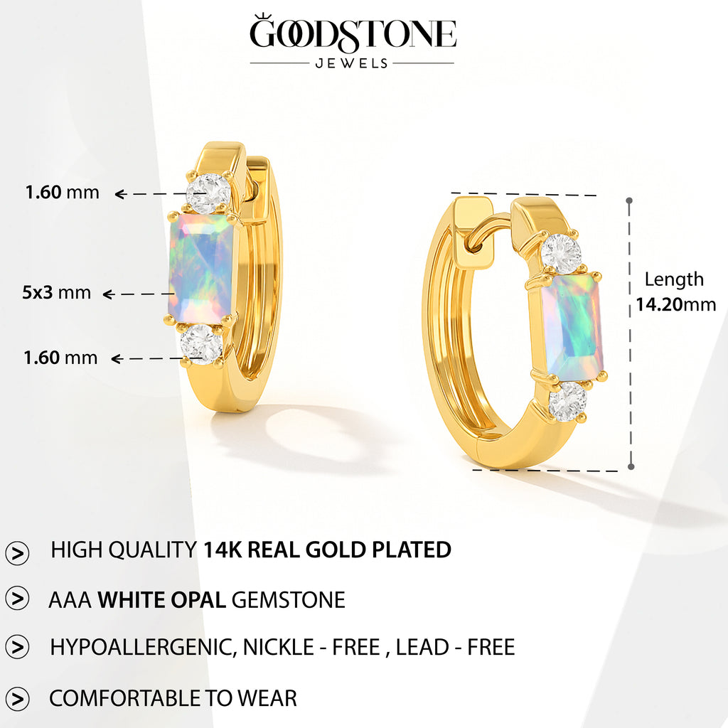 White OpalElevate your style with these elegant Baguette Stone Hoop Earrings, crafted in premium 925 Sterling Silver. Each earring features natural white opal baguette stones measuring 5x3 mm, offering a vibrant pop of color and refined sparkle. The hoops measure 14.20×10.00 mm and weigh 2.95 g, making them lightweight yet luxurious for all-day wear. With a total gemstone weight of 0.80 carat, these white opal hoops bring timeless charm and a sophisticated finish to any jewelry collection.