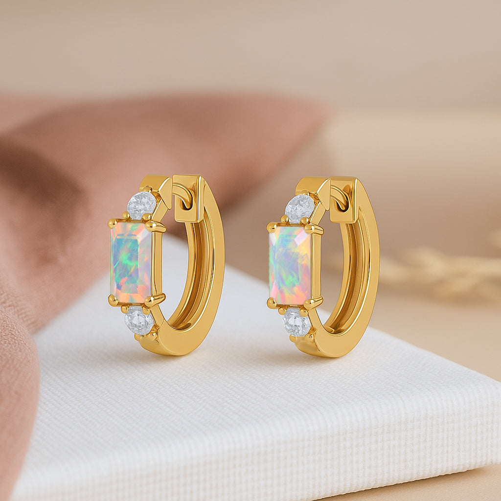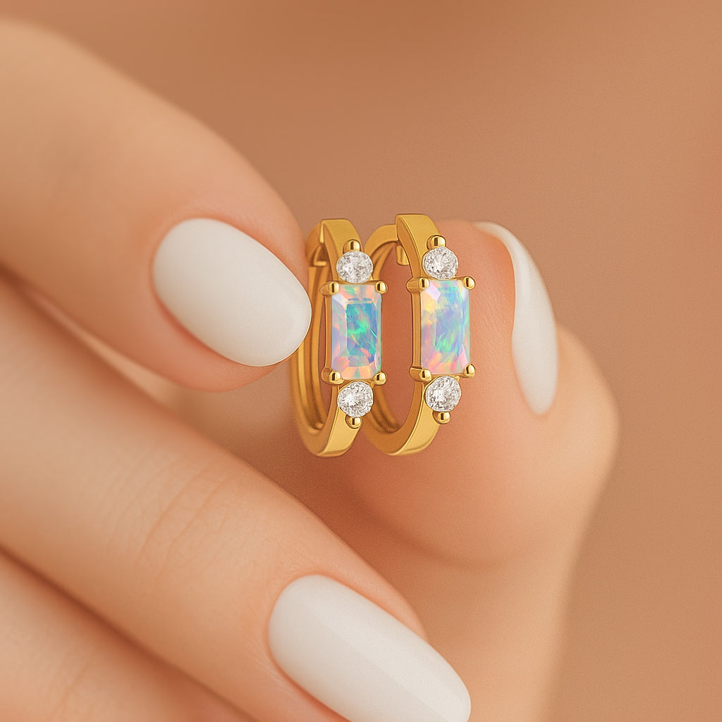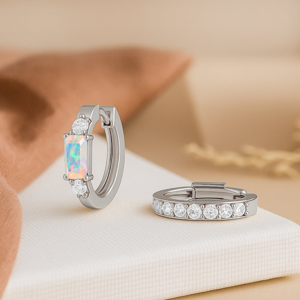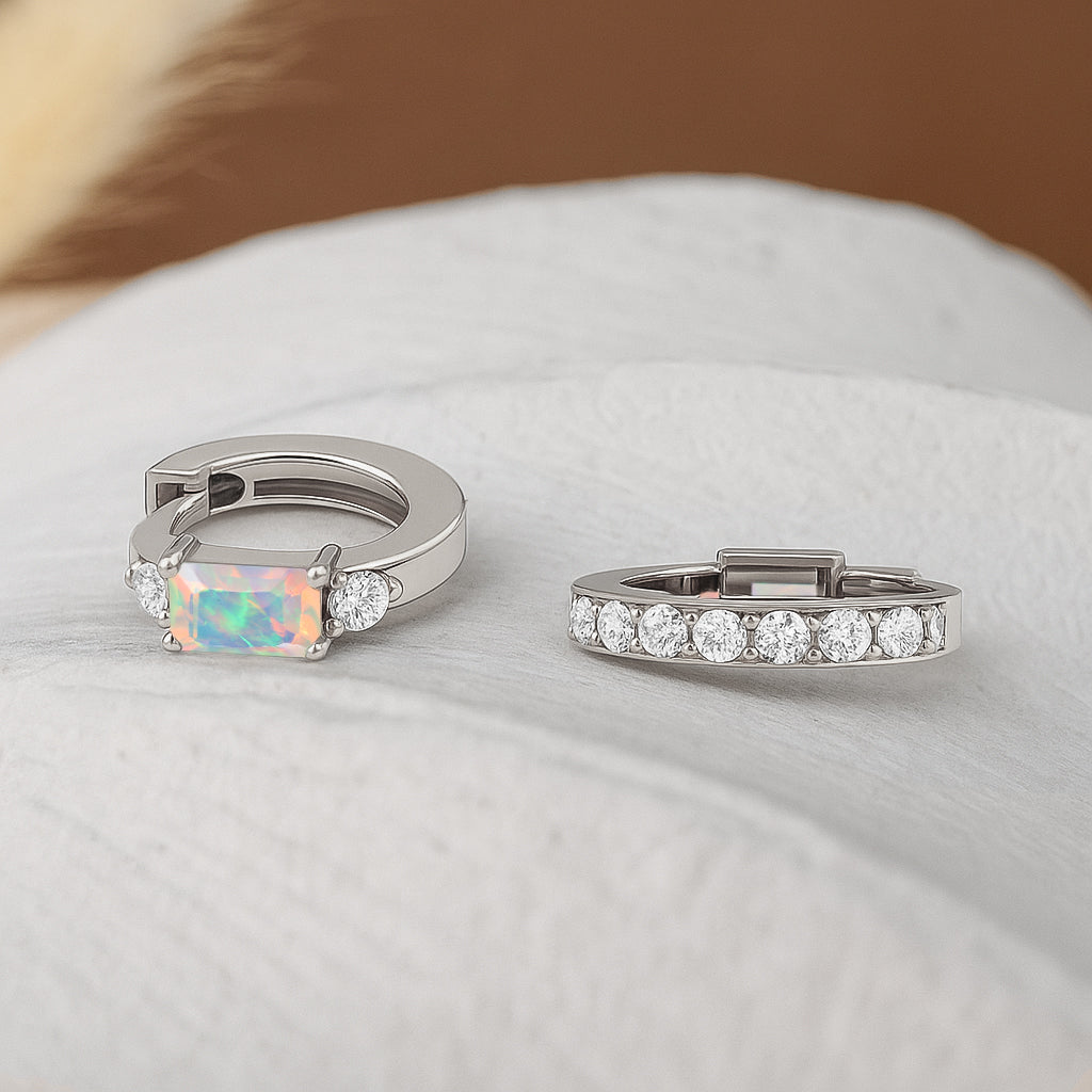 White OpalElevate your style with these elegant Baguette Stone Hoop Earrings, crafted in premium 925 Sterling Silver. Each earring features natural white opal baguette stones measuring 5x3 mm, offering a vibrant pop of color and refined sparkle. The hoops measure 14.20×10.00 mm and weigh 2.95 g, making them lightweight yet luxurious for all-day wear. With a total gemstone weight of 0.80 carat, these white opal hoops bring timeless charm and a sophisticated finish to any jewelry collection.