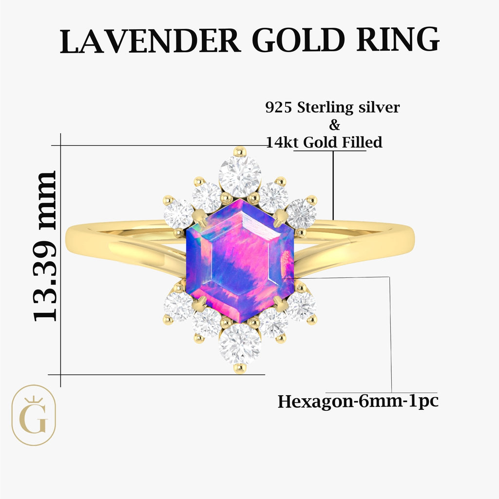 This eye-catching ring features a mesmerizing lavender opal gemstone cut into a unique hexagon shape. Sparkling round CZ diamonds add extra shimmer and shine. The ring is made with 925 sterling silver, making it a statement piece perfect for both everyday wear and special events.