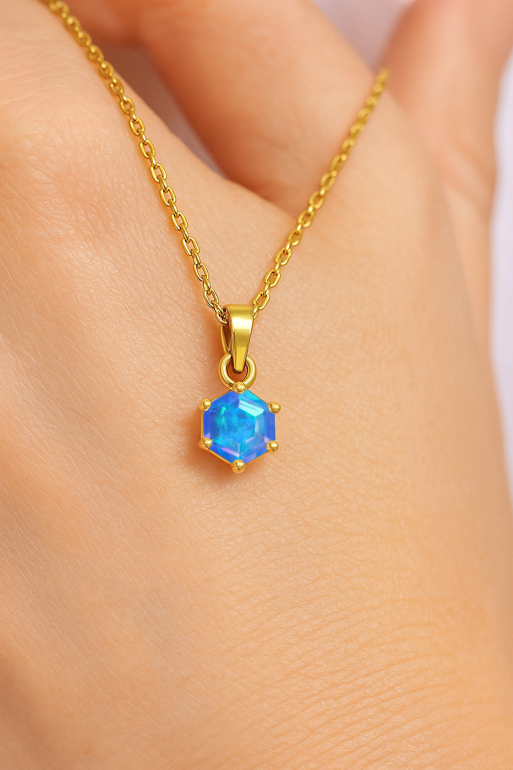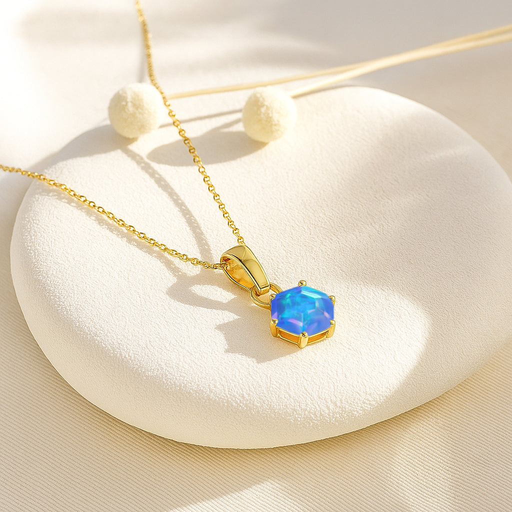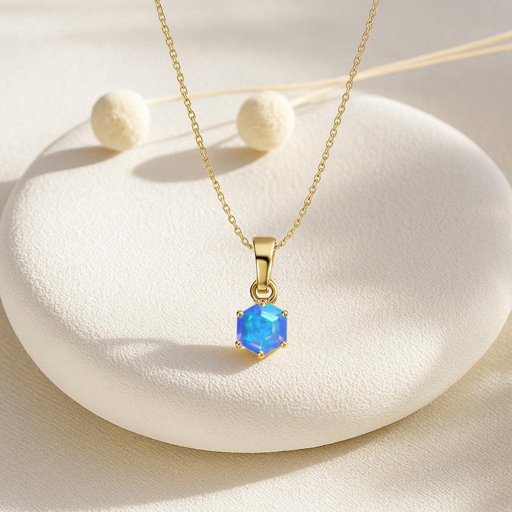 Blue OpalAdd a touch of modern elegance with this Blue Opal Hexagon Stone Pendant Necklace, crafted in fine 925 sterling silver. The design features a striking 7 mm hexagon-cut blue opal weighing 1.20 carat, showcasing bold color and geometric charm. The pendant measures 17.50×7.00 mm and hangs gracefully from a 16″ + 2″ adjustable cable chain. With an approximate weight of 1.56 g, this lightweight yet luxurious piece is perfect for everyday wear or special occasions, offering timeless beauty in a unique shape.