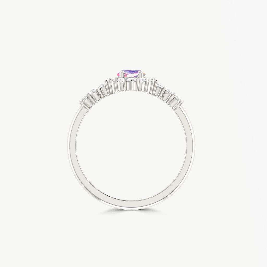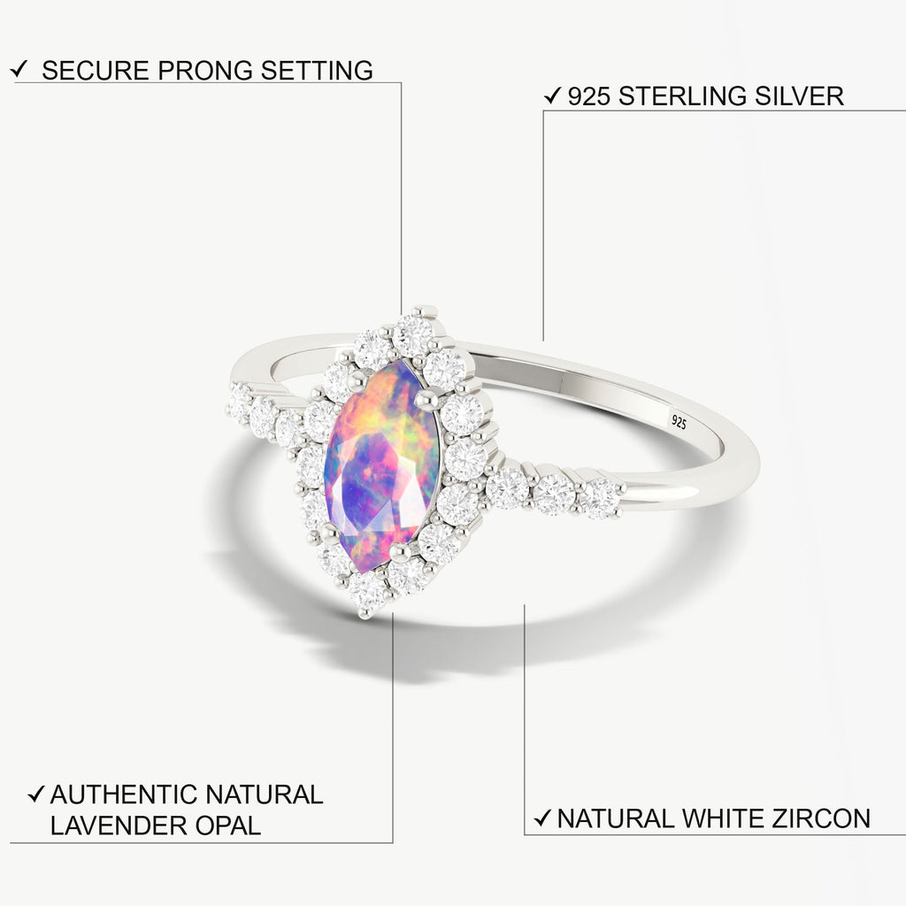 Lavender OpalThis stunning Natural Lavender Opal Halo Wedding Ring. Featuring a rare 8x4 mm marquise-cut Lavender opal, the center stone is beautifully set in a radiant halo design that enhances its brilliance and depth. Crafted from solid 925 sterling silver, this exquisite ring combines premium craftsmanship with a luxurious appearance. The halo design adds vintage charm while maintaining a modern, graceful style that suits any occasion, from daily wear to weddings or special events. The hypoallergenic silver band ensures long-lasting comfort and shine, making it ideal for sensitive skin.