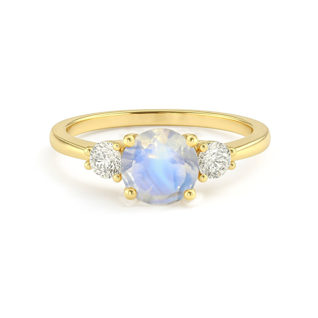 MoonstoneCelebrate timeless elegance and meaningful symbolism with this exquisite Trilogy Ring, expertly crafted in 925 Sterling Silver with Yellow Gold Plating. At its heart lies a 6mm round-cut natural Moonstone, shimmering with its signature play of color and weighing approximately 1 carat. Flanked on either side by brilliant White Cubic Zirconia stones, the trio of gems represents the past, present, and future, making this ring a perfect token of love, memory, and promise, Each gemstone is faceted cut to maximize brilliance and fire, creating a captivating visual contrast between the mystic allure of the Moonstone and the icy sparkle of Cubic Zirconia. With a metal weight of 2.60 grams, this piece is both lightweight and durable, making it suitable for everyday wear or special occasions.
