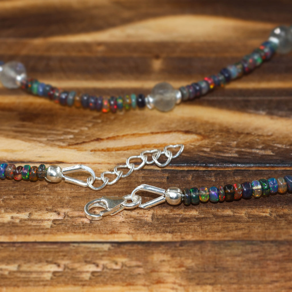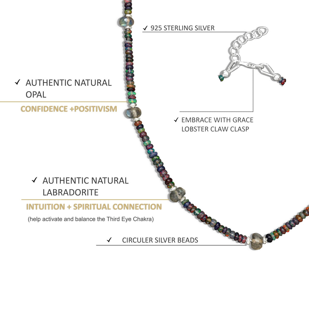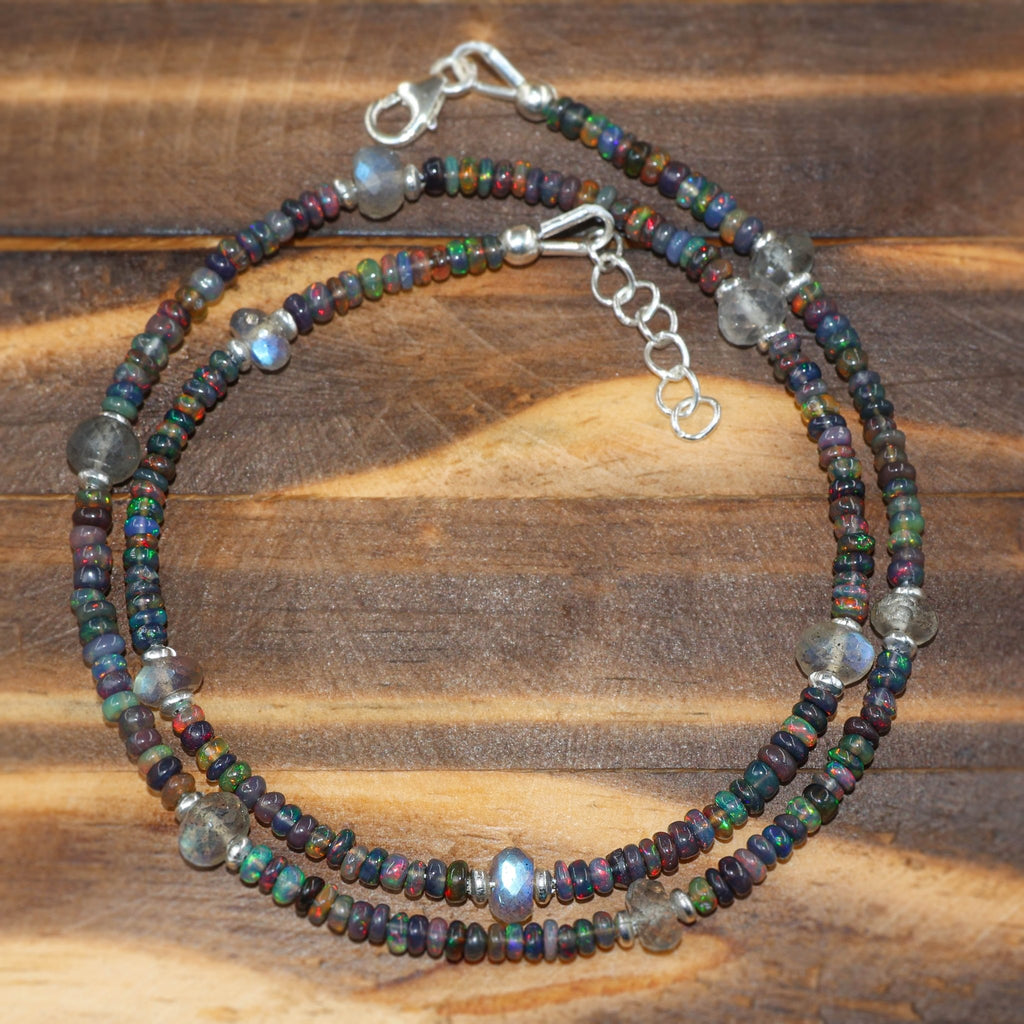 GOODSTONE JEWELS presents a stunning fusion of nature’s finest—Natural Moonstone and Black Opal—in a beautifully handcrafted dual beaded necklace. Each 3X5 MM smooth rondelle bead is carefully selected and hand-strung to reflect light with a subtle shimmer that captivates and complements any look, day or night.