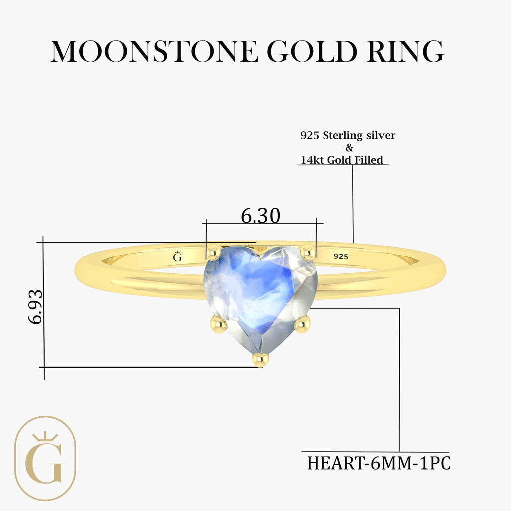 MoonstoneElevate your jewelry collection with this stunning Natural Moonstone Heart Ring, masterfully crafted in 925 sterling silver and a luxurious yellow gold-filled finish. At the heart of this minimalist design is a captivating 6mm faceted Moonstone, shaped into a delicate heart and weighing approximately 0.8 carats. Its dazzling play of color makes each ring truly one-of-a-kind, reflecting both beauty and individuality. Designed with a sleek and stackable silhouette, this ring can be worn solo for understated elegance or layered with your favorite pieces for a personalized, fashion-forward look. Whether you're dressing up for an event or accenting your everyday outfit, this ring is perfect.