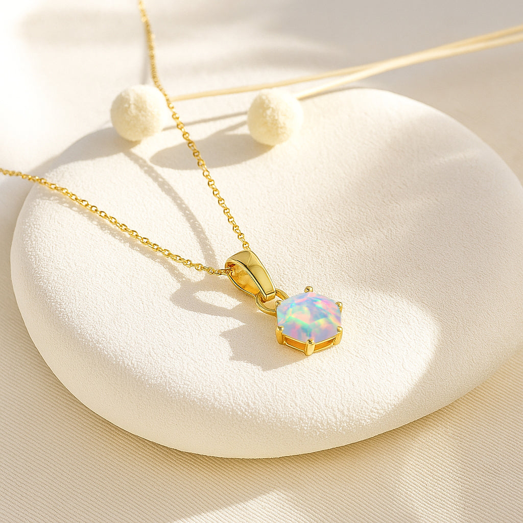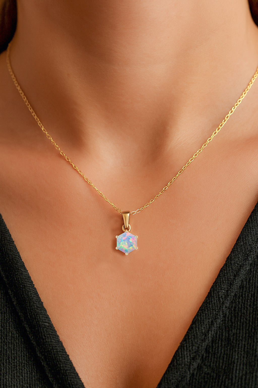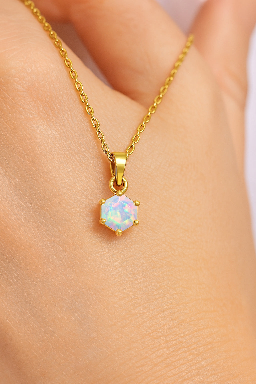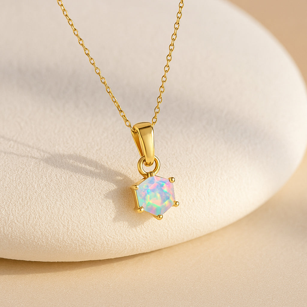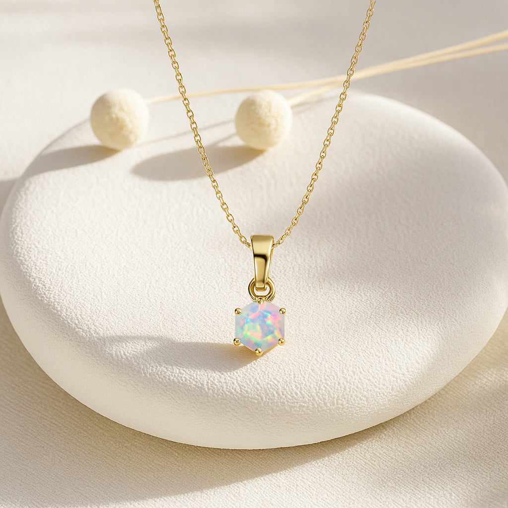 White OpalAdd a touch of modern elegance with this White Opal Hexagon Stone Pendant Necklace, crafted in fine 925 sterling silver. The design features a striking 7 mm hexagon-cut white opal weighing 1.20 carat, showcasing bold color and geometric charm. The pendant measures 17.50×7.00 mm and hangs gracefully from a 16″ + 2″ adjustable cable chain. With an approximate weight of 1.56 g, this lightweight yet luxurious piece is perfect for everyday wear or special occasions, offering timeless beauty in a unique shape.