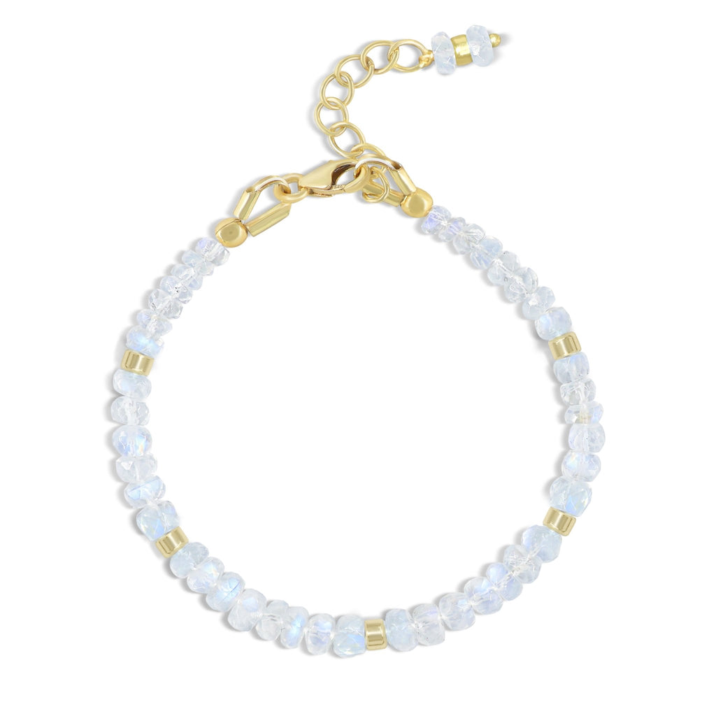MoonstoneSeparator Bead Strand Rondelle Bracelet for Women, a handcrafted piece that blends natural beauty with refined design. Adorned with genuine white Moonstone beads, this bracelet adds a radiant splash of color and sophistication to any look. Made with Yellow Gold-Filled accents and 925 Sterling Silver, this bracelet is built for durability and long-lasting shine. The sleek rondelle bead design creates a graceful silhouette, while the 1-inch extension chain and secure lobster claw clasp ensure a comfortable and adjustable fit for any wrist.