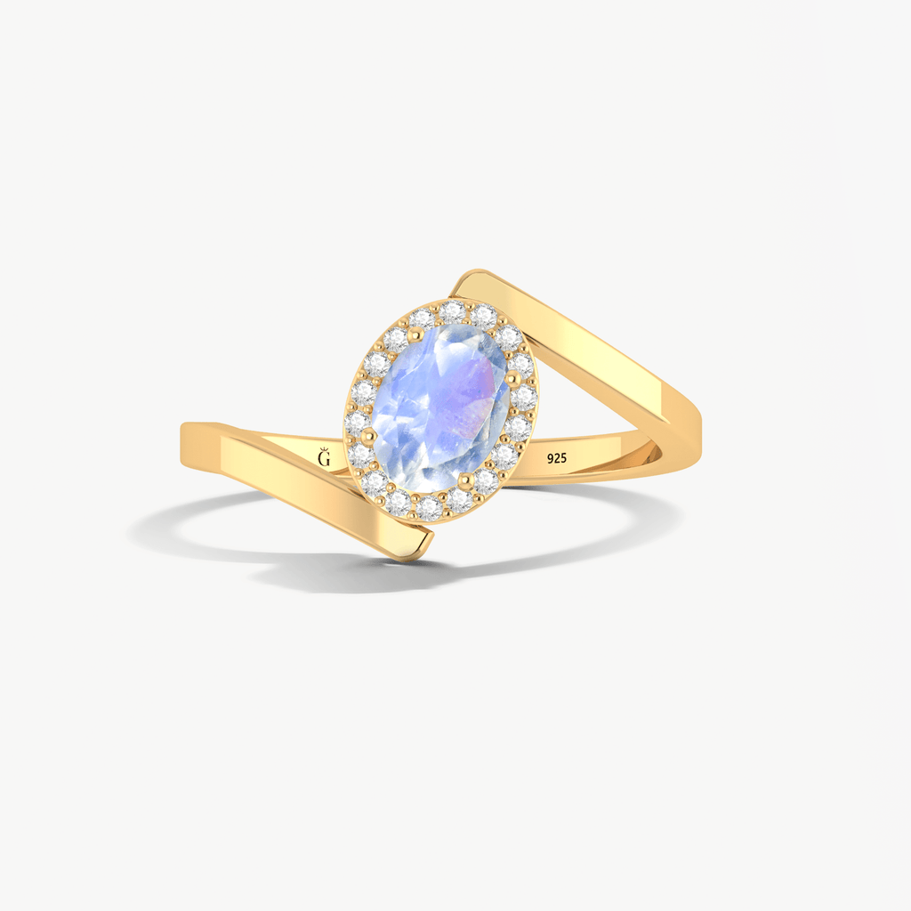 MoonstoneNatural Moonstone Bypass Halo Ring for womens crafted in 925 Sterling Silver with a radiant yellow gold filled finish. At its heart lies a stunning 7x5mm oval faceted Moonstone, renowned for its captivating play of color and deep, mystical allure. This unique gemstone is perfect for the woman who appreciates beauty, meaning, and sophistication in her jewelry. Designed with both luxury and comfort in mind, this handcrafted ring offers hypoallergenic wear and a durable finish that retains its shine over time. Whether worn daily or reserved for special occasions, it complements every look with effortless elegance.