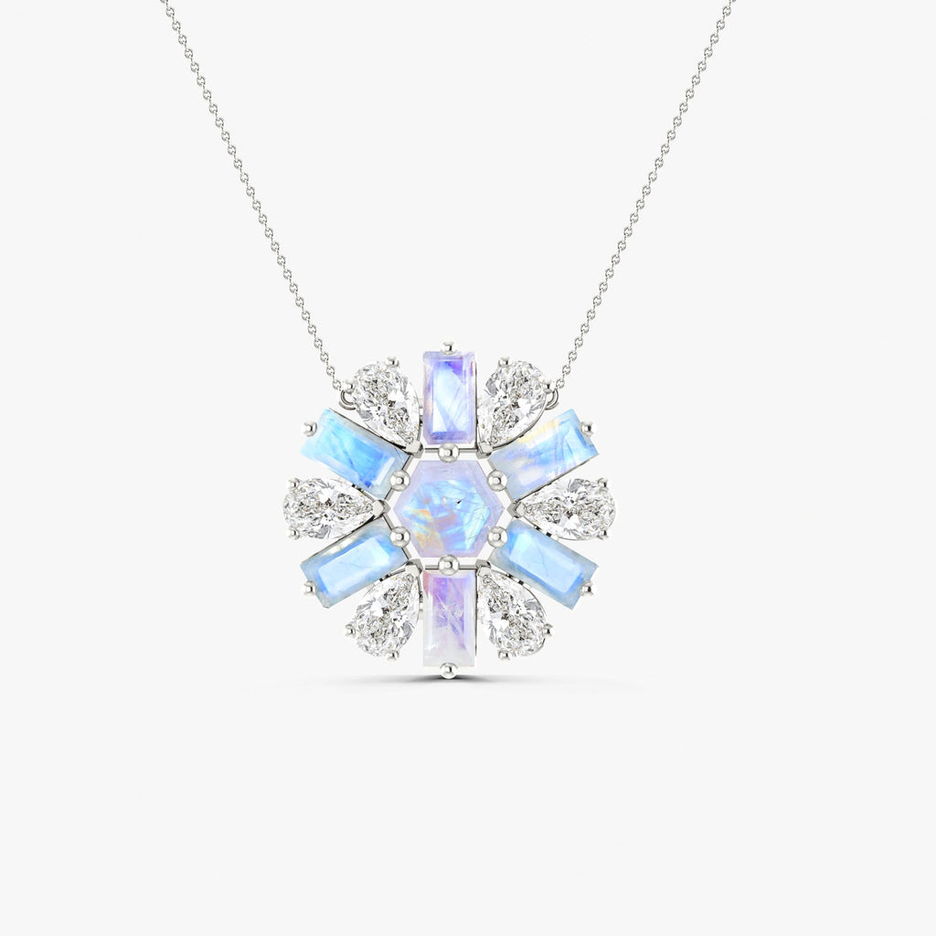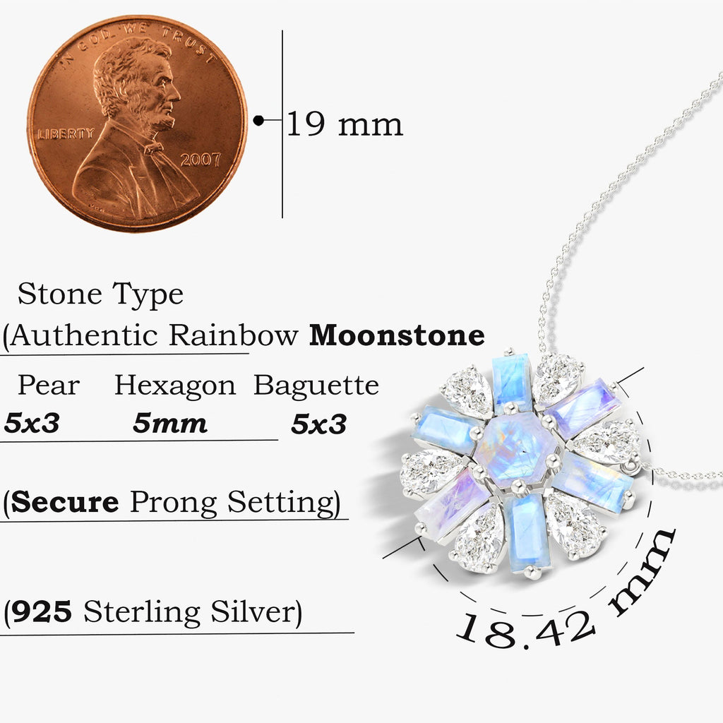 MoonstoneGOODSTONE JEWELS Round Charm Pendant Necklace, a stunning fusion of classic design and natural beauty. Expertly crafted in 925 sterling silver, this necklace is the perfect accessory to enhance any look, from casual chic to elegant evening wear. At the heart of this exquisite piece is a 2.0-carat natural moonstone, renowned for its captivating play of colors. The unique gemstone is complemented by a 5mm hexagon-cut center stone and six 5x3mm baguette-cut accents, creating a mesmerizing effect that draws the eye and adds a sophisticated sparkle. Designed with comfort and versatility in mind, the necklace features a 16-inch cable chain with a 2-inch extender, allowing for a perfect fit with any neckline. Despite its bold appearance, the pendant is lightweight at just 3.80 grams, ensuring effortless all-day wear.