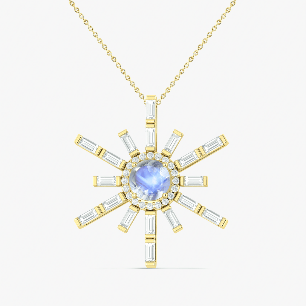 MoonstoneGOODSTONE JEWELS Natural Moonstone Sun Charm Pendant Necklace. This exquisite piece features a stunning sun charm adorned with vibrant natural gemstones moonstone in 925 sterling silver with a luxurious yellow gold-filled finish. It’s the perfect blend of elegance and celestial inspiration, designed to complement any outfit. The necklace is not just beautiful but also versatile, offering an adjustable 16-inch cable chain with a 2-inch extender. This ensures a perfect fit for a variety of necklines and allows for layering with other jewelry pieces. Whether you're dressing up for a special occasion or adding a touch of sparkle to your daily attire, this necklace will enhance your look.