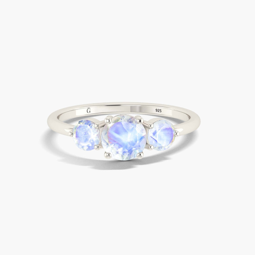 MoonstoneNatural Moonstone 3-Stone Engagement Ring, beautifully crafted in 925 Sterling Silver for a luxurious yet durable finish. This timeless piece features a dazzling 6mm round Moonstone center stone, flanked by two sparkling 4mm round accent Moonstones, totaling 1.5 carats of radiant brilliance. The three-stone design symbolizes your past, present, and future, making it a perfect choice for engagements, anniversaries, weddings, or as a promise ring for her. Set in high-quality hypoallergenic sterling silver, the ring is both elegant and comfortable for everyday wear.