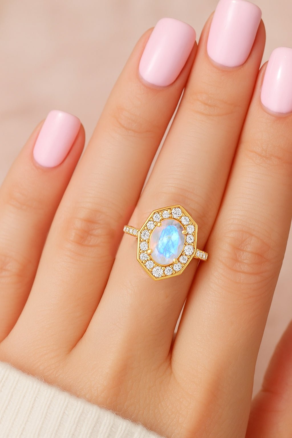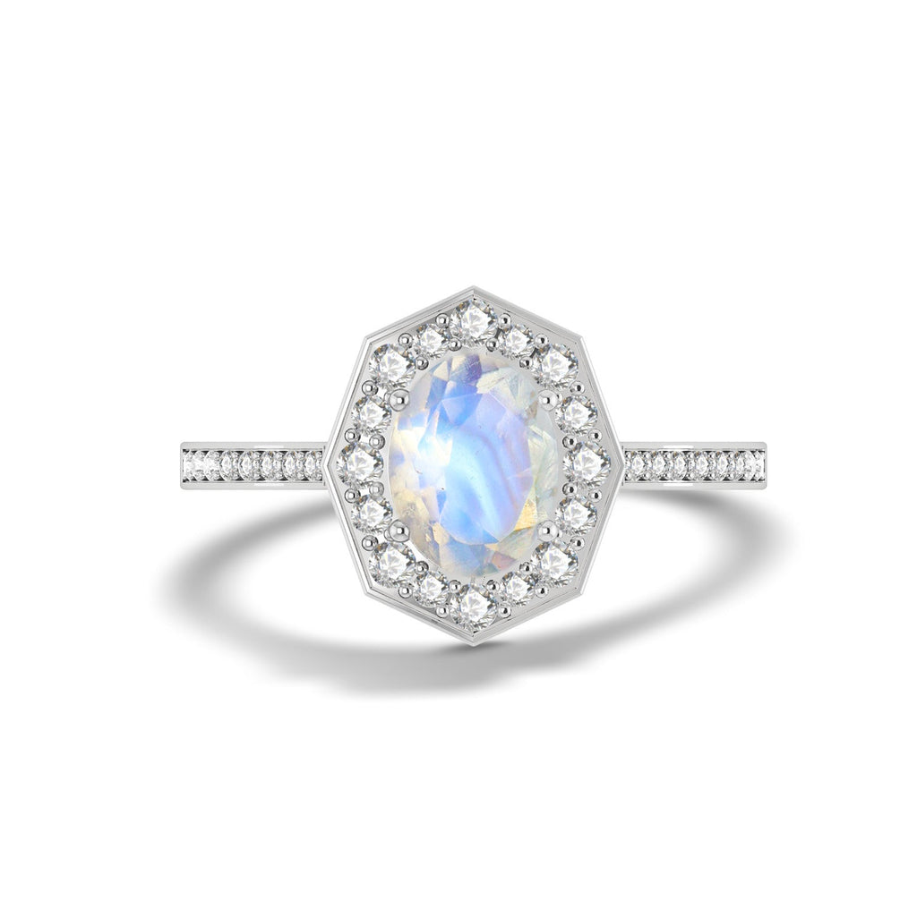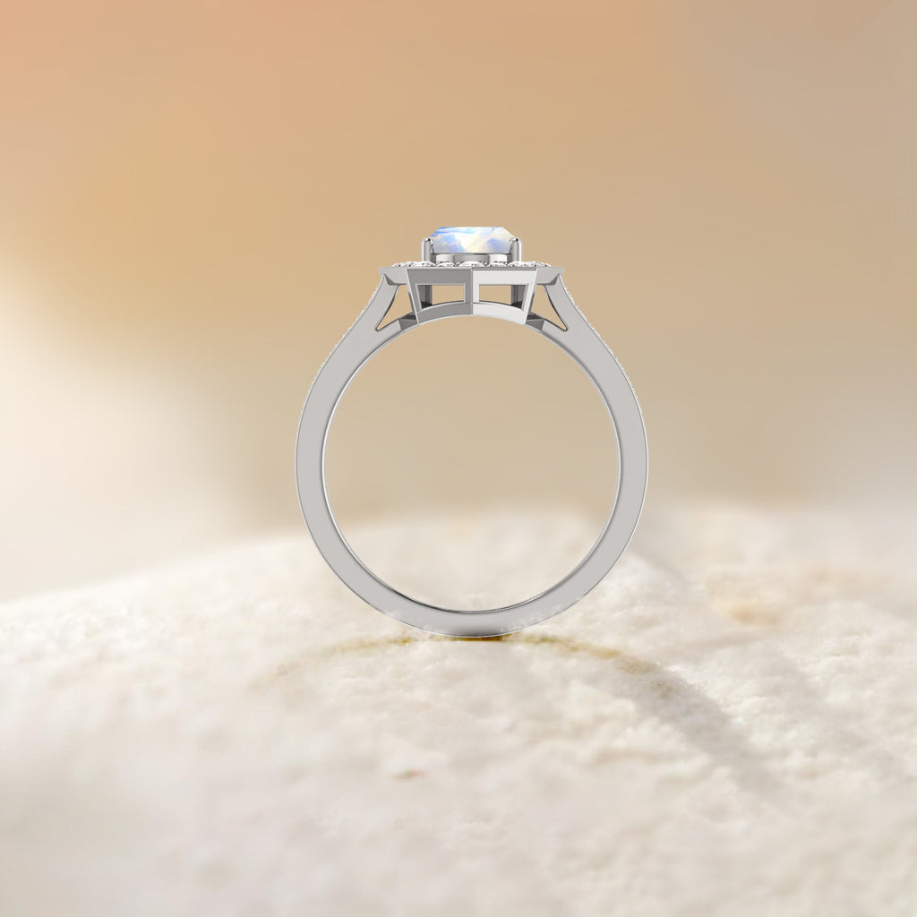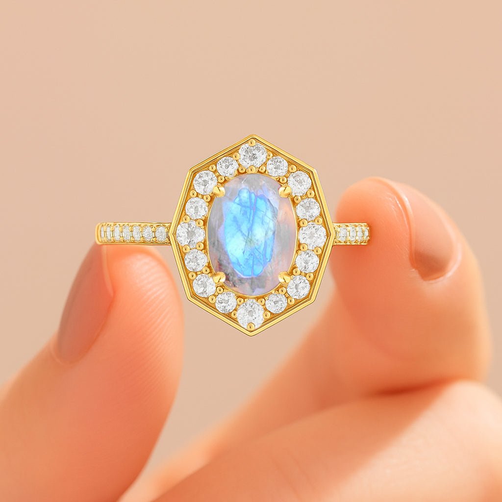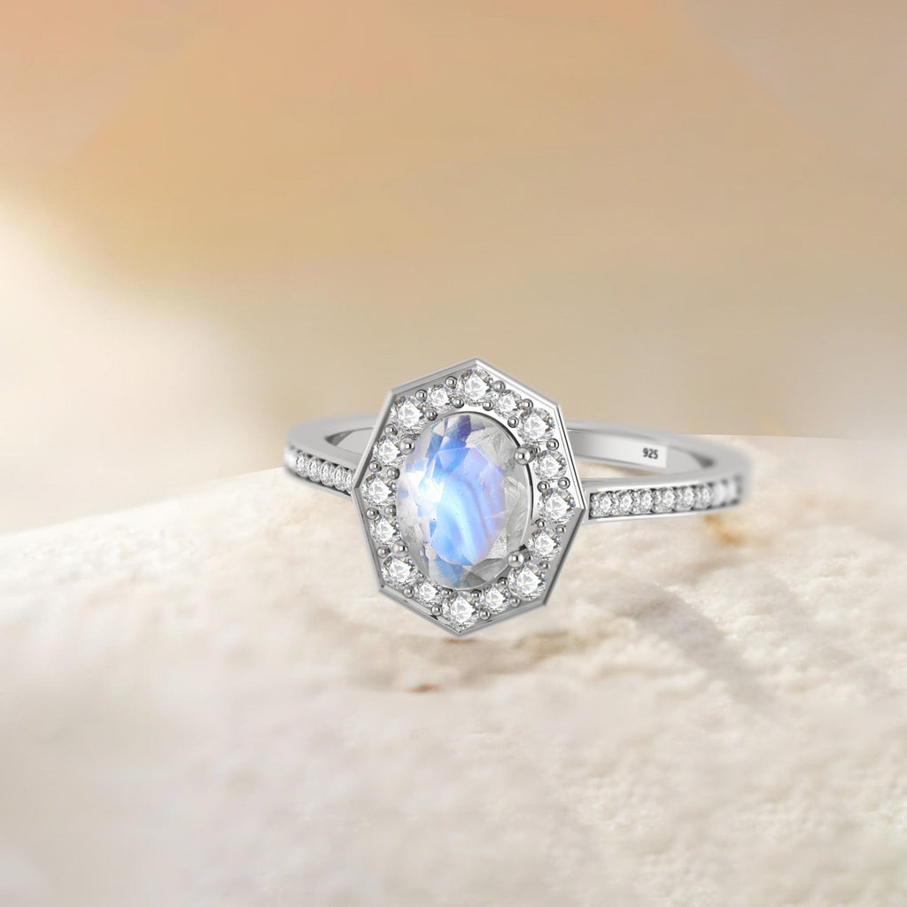 MoonstoneNatural Moonstone 925 Sterling Silver Engagement Halo Ring for Women. This exquisite piece features a mesmerizing 8x6mm oval-shaped Moonstone (1.0 carat), renowned for its vibrant play-of-color and timeless beauty. Set in solid 925 sterling silver and finished in luxurious yellow gold fill, this ring brings sophistication to any jewelry collection. Designed in a bold octagon-style setting, the ring boasts a face size of approximately 13.73mm and a weight of 4.30 grams, striking enough to make a Engagement Halo, yet comfortable enough for daily wear. Whether you're dressing up for a formal occasion or adding sparkle to your everyday outfit, this ring is sure to impress. This piece makes an unforgettable gift for your wife, girlfriend, or mother, perfect for anniversaries, birthdays, weddings, or engagements.