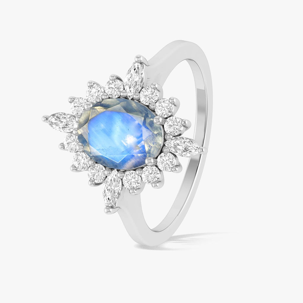 MoonstoneNatural Moonstone 925 Sterling Silver Halo Ring featuring a vibrant 9x7 mm oval-cut natural Moonstone, this ring captivates with its fiery color play and unique charm, making it the perfect Halo piece for any special occasion or everyday luxury. Crafted with premium 925 sterling silver, the band is hypoallergenic and built to last, offering both durability and refined beauty. Whether you're celebrating an anniversary, birthday, wedding, or Valentine’s Day, this exquisite Moonstone ring makes an unforgettable gift for the woman you love. It's 1.0 carat weight and elegant design reflect both sentiment and style, making it a treasured keepsake she’ll cherish forever.