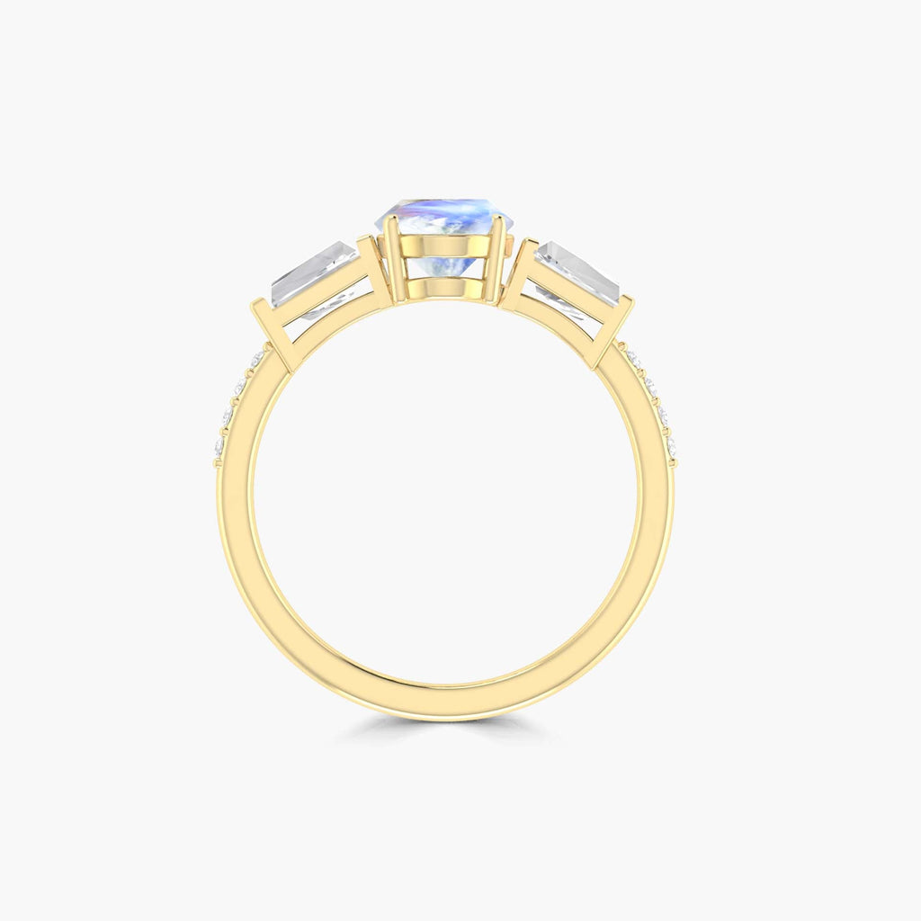 MoonstoneA Gift She'll Treasure Forever, Indulge in timeless elegance with our Natural Moonstone Three Stone Engagement Ring, masterfully crafted in genuine 925 sterling silver and finished in radiant yellow gold plating. The centerpiece is a stunning 8x6 mm oval-cut natural Moonstone (0.9 carat) known for its mesmerizing play-of-color. each stone is one-of-a-kind, making every ring uniquely captivating. This elegant and three-stone engagement ring is perfect for women who love minimalist luxury. Its slender design allows it to be worn solo for a dainty look or stacked with other rings for a more expressive style. Whether you're dressing up for a special event or adding charm to everyday wear, this piece effortlessly complements any outfit. Crafted with comfort in mind, the ring is hypoallergenic and tarnish-resistant, making it suitable for daily wear.