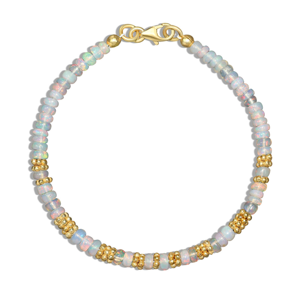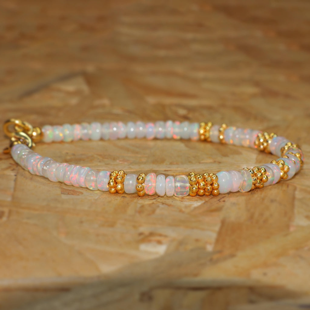 The Natural Opal Rondelle Beaded Bracelet for Women is a stunning piece that beautifully captures the iridescent glow of natural opal gemstones. Each bead cut in a delicate rondelle shape, showcases a unique spectrum of colors, ranging from soft pastels to vibrant flashes of blue, green, and pink. This bracelet embodies elegance and simplicity, making it a versatile accessory for both everyday wear and special occasions.