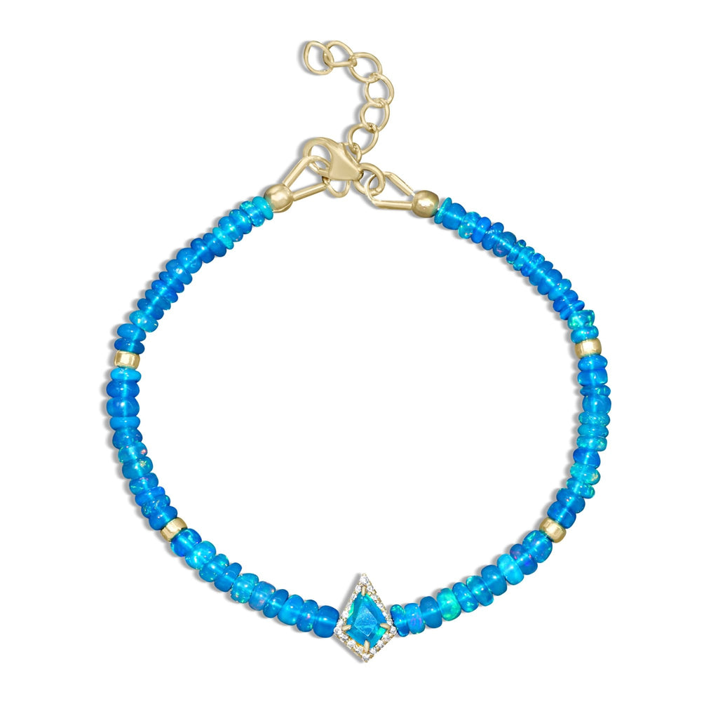 Paraiba OpalElevate your everyday style with this stunning bracelet handcrafted from natural paraiba Opal gemstones. Featuring smooth 3x4mm rondelle beads in dreamy oceanic hues, this piece captures the tranquil beauty of tropical waters. Sleek 5x7mm plain kite-shaped charms add a modern, elegant twist to the design.