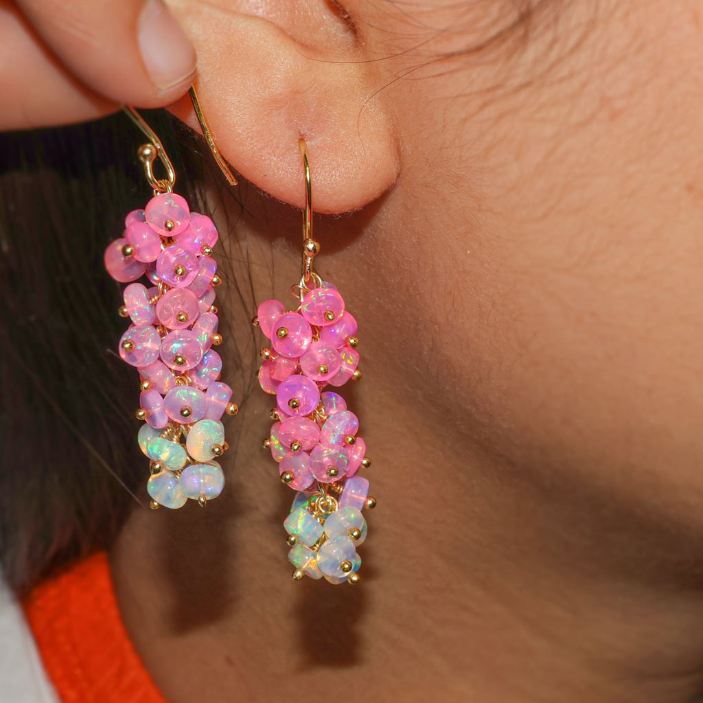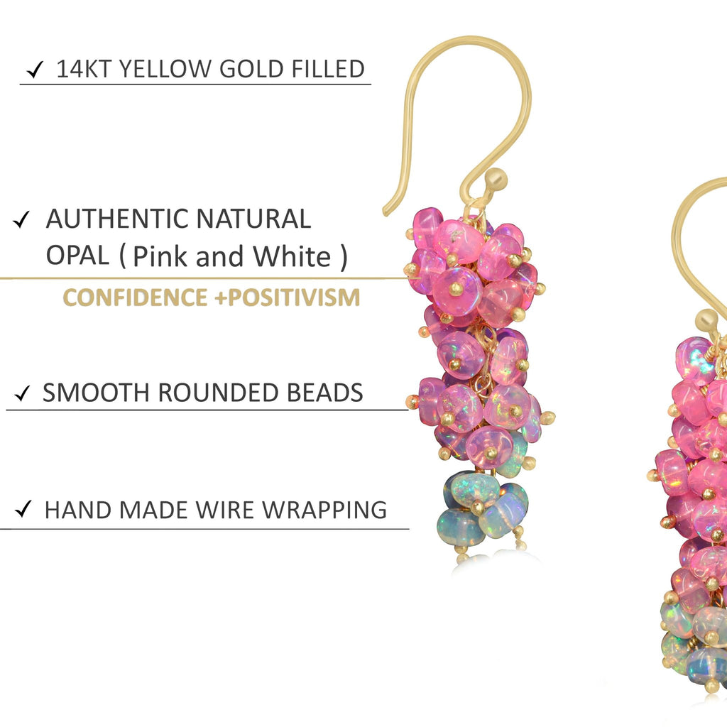 Pink OpalNatural Opal Beaded Cluster Earrings featuring a stunning array of green, pink, purple, blue, and lavender opals, these earrings are designed to make a statement. The beautiful yellow gold-filled 925 sterling silver setting ensures durability while adding a luxurious touch, making these earrings a perfect match for both everyday wear and special occasions.