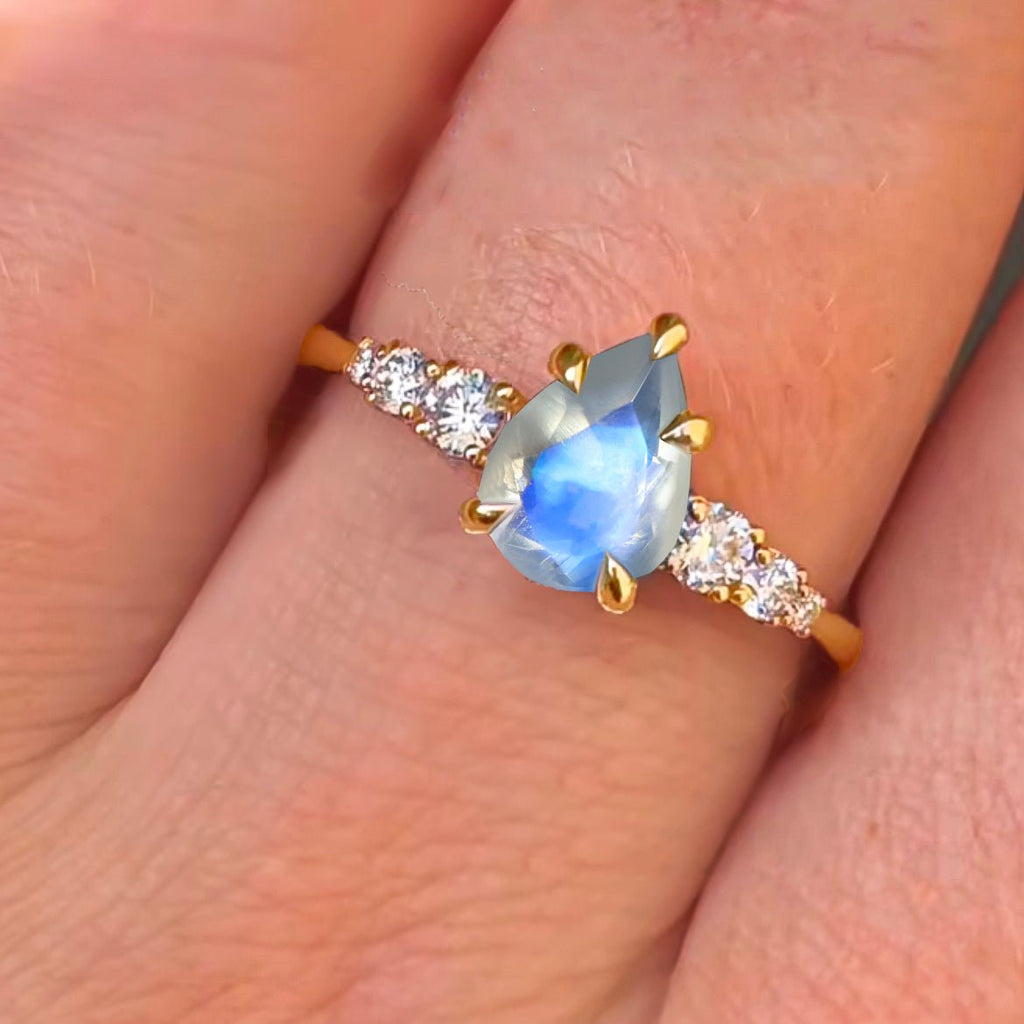MoonstoneThis ring features a beautiful pear-shaped moonstone gemstone with a soft, glowing look. Sparkling round cubic zirconia diamonds add a touch of sparkle. The ring is made of sterling silver and is perfect for everyday wear or special occasions.