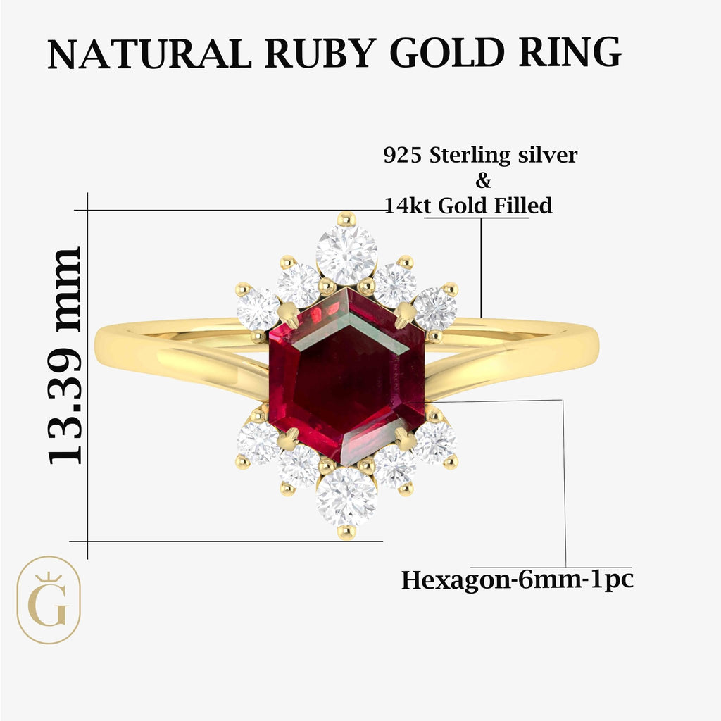 RubyThis striking ring features a bold, hexagon-shaped ruby gemstone in a rich, vibrant red. Sparkling round CZ diamonds add a touch of luxurious brilliance. Set in sleek sterling silver, it's a perfect piece to add a touch of fiery elegance to any look.