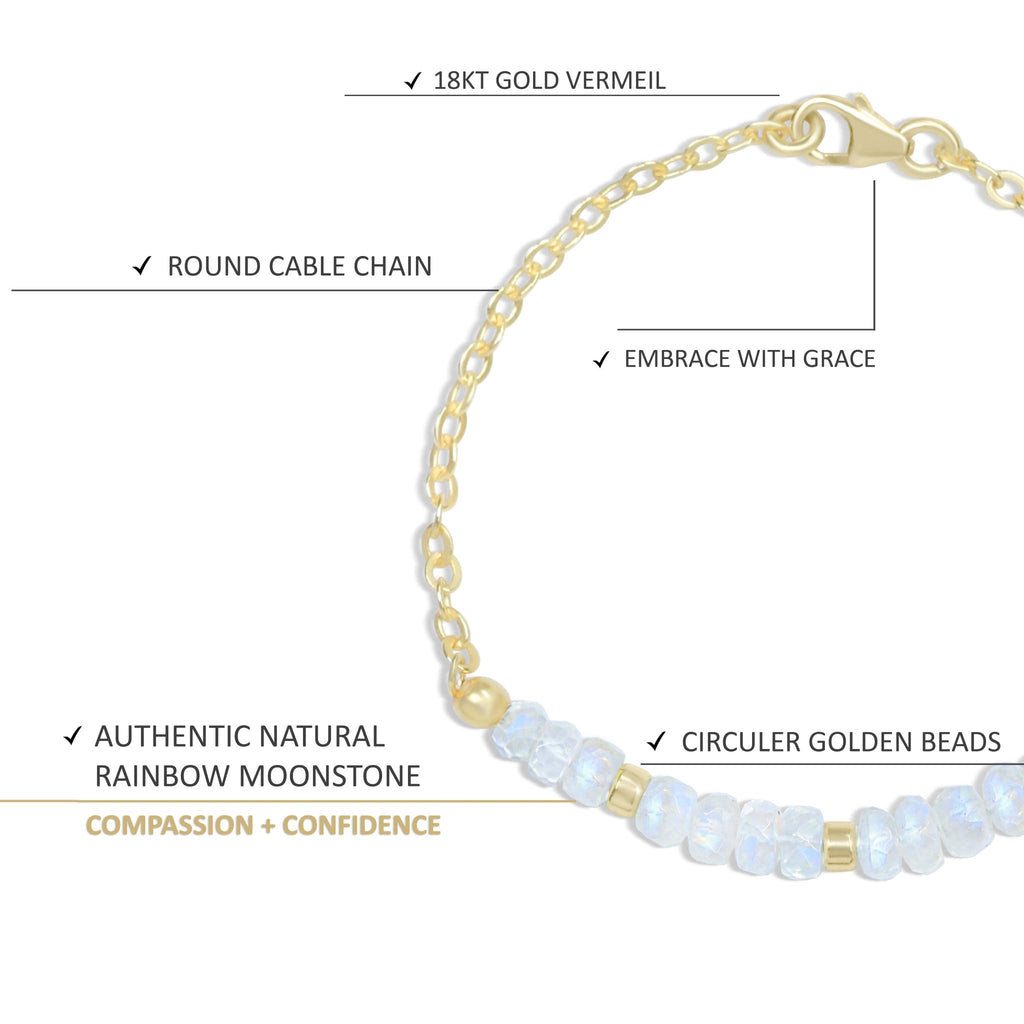 Experience the beauty and natural healing properties of our Natural Rainbow Moonstone Faceted Beads Chain Bracelet. The faceted beads provide a stunning iridescent sparkle, while the rainbow moonstone is believed to promote inner peace and balance. A perfect way to elevate your style while enhancing your well-being.
