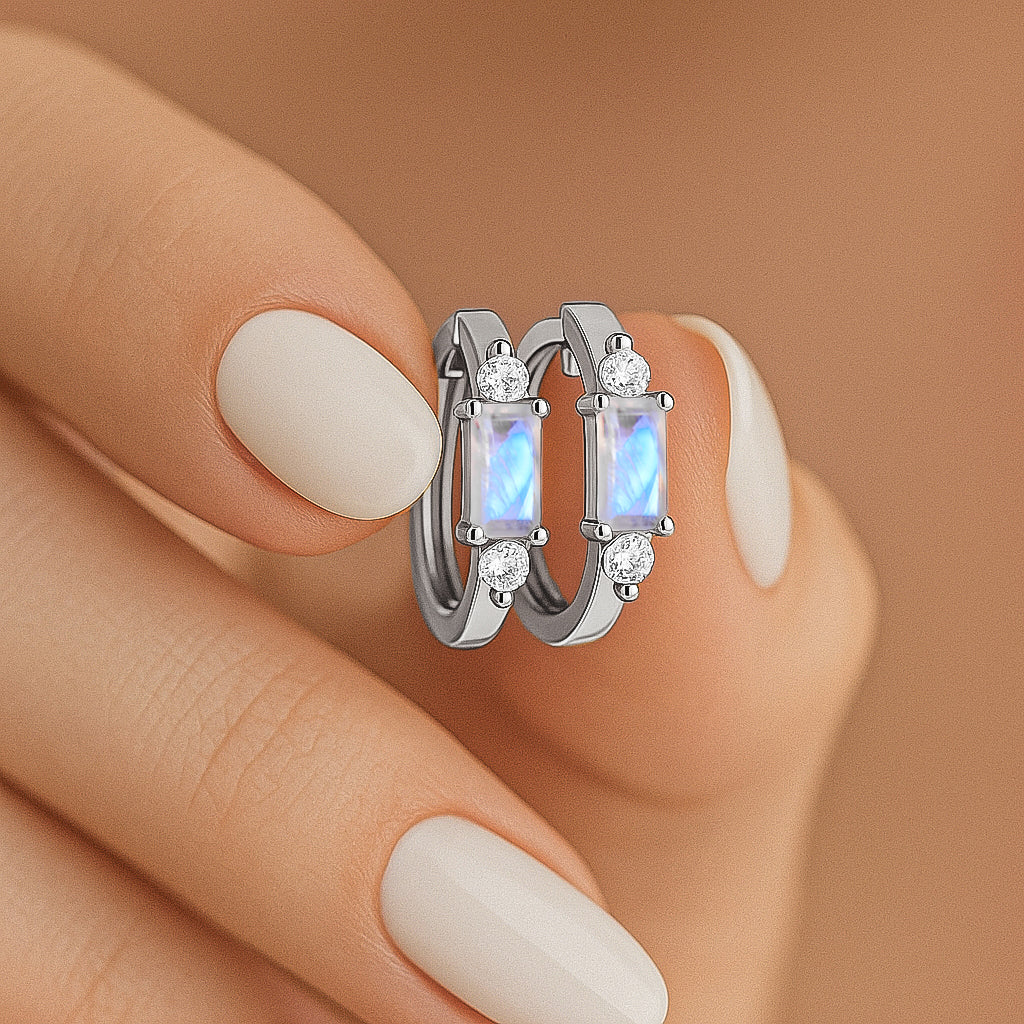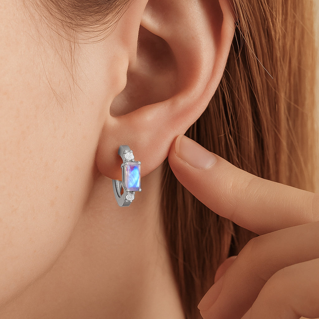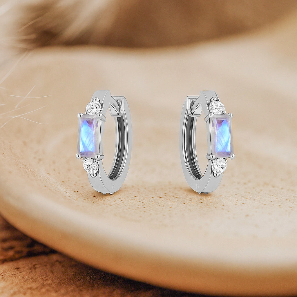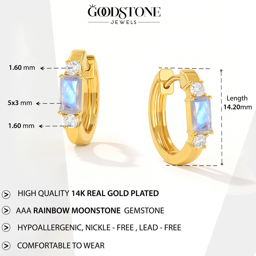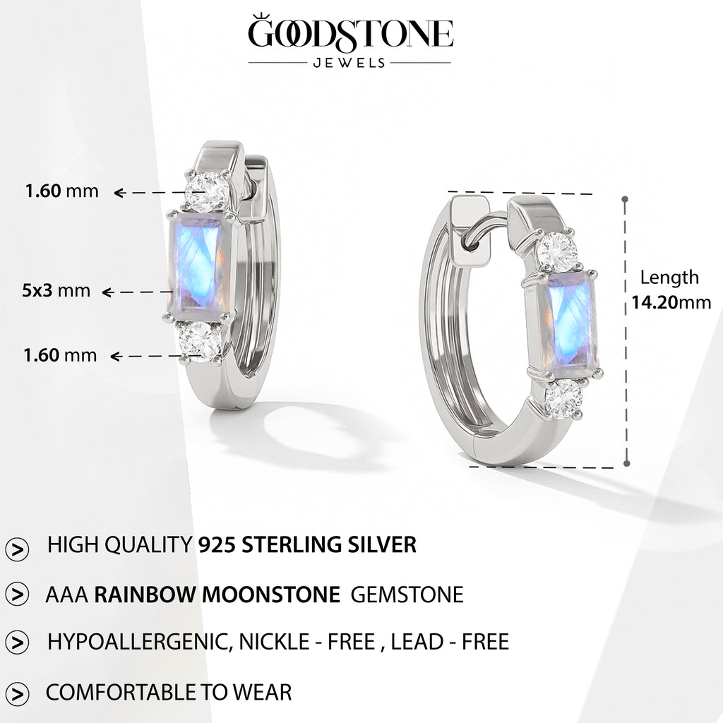 MoonstoneElevate your style with these elegant Baguette Stone Hoop Earrings, crafted in premium 925 Sterling Silver. Each earring features natural moonstone baguette stones measuring 5x3 mm, offering a vibrant pop of color and refined sparkle. The hoops measure 14.20×10.00 mm and weigh 2.95 g, making them lightweight yet luxurious for all-day wear. With a total gemstone weight of 0.80 carat, these moonstone hoops bring timeless charm and a sophisticated finish to any jewelry collection.