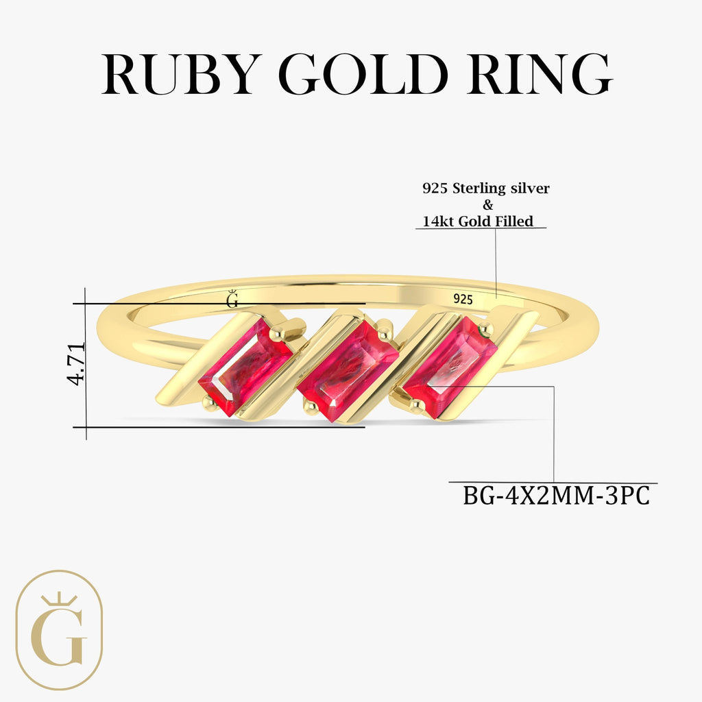 RubyNatural Ruby 3-Stone Ring, beautifully handcrafted in 925 Sterling Silver. This luxurious ring features three 4x2 mm baguette-cut genuine Ruby, each carefully faceted to enhance its mesmerizing play of color a signature trait of this rare birthstone. Whether you're shopping for a unique engagement ring, an anniversary surprise, or a promise ring for her, this design makes a heartfelt The trio of natural Rubys symbolizes past, present, and future, making it the perfect token of enduring love.