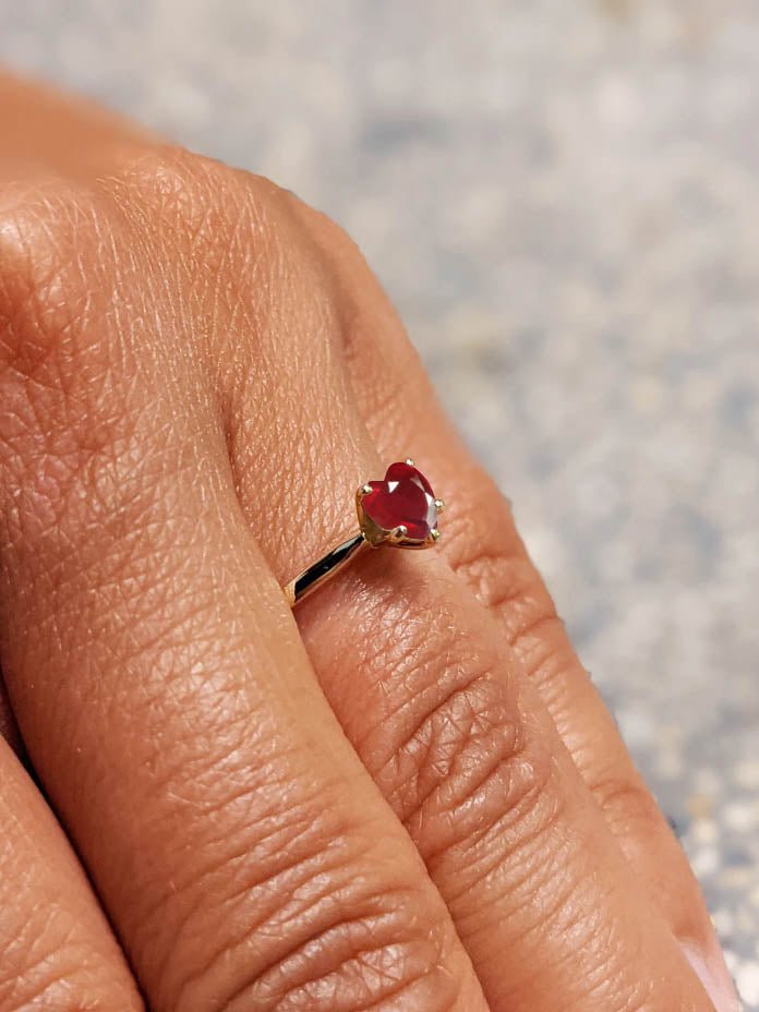 RubyElevate your jewelry collection with this stunning Natural Ruby Heart Ring, masterfully crafted in 925 sterling silver and luxurious yellow gold-filled finish. At the heart of this minimalist design is a captivating 6mm faceted Ruby, shaped into a delicate heart and weighing approximately 0.8 carats. Its dazzling play of color makes each ring truly one-of-a-kind, reflecting both beauty and individuality. Designed with a sleek and stackable silhouette, this ring can be worn solo for understated elegance or layered with your favorite pieces for a personalized, fashion-forward look. Whether you're dressing up for an event or accenting your everyday outfit, this ring is the perfect finishing touch.