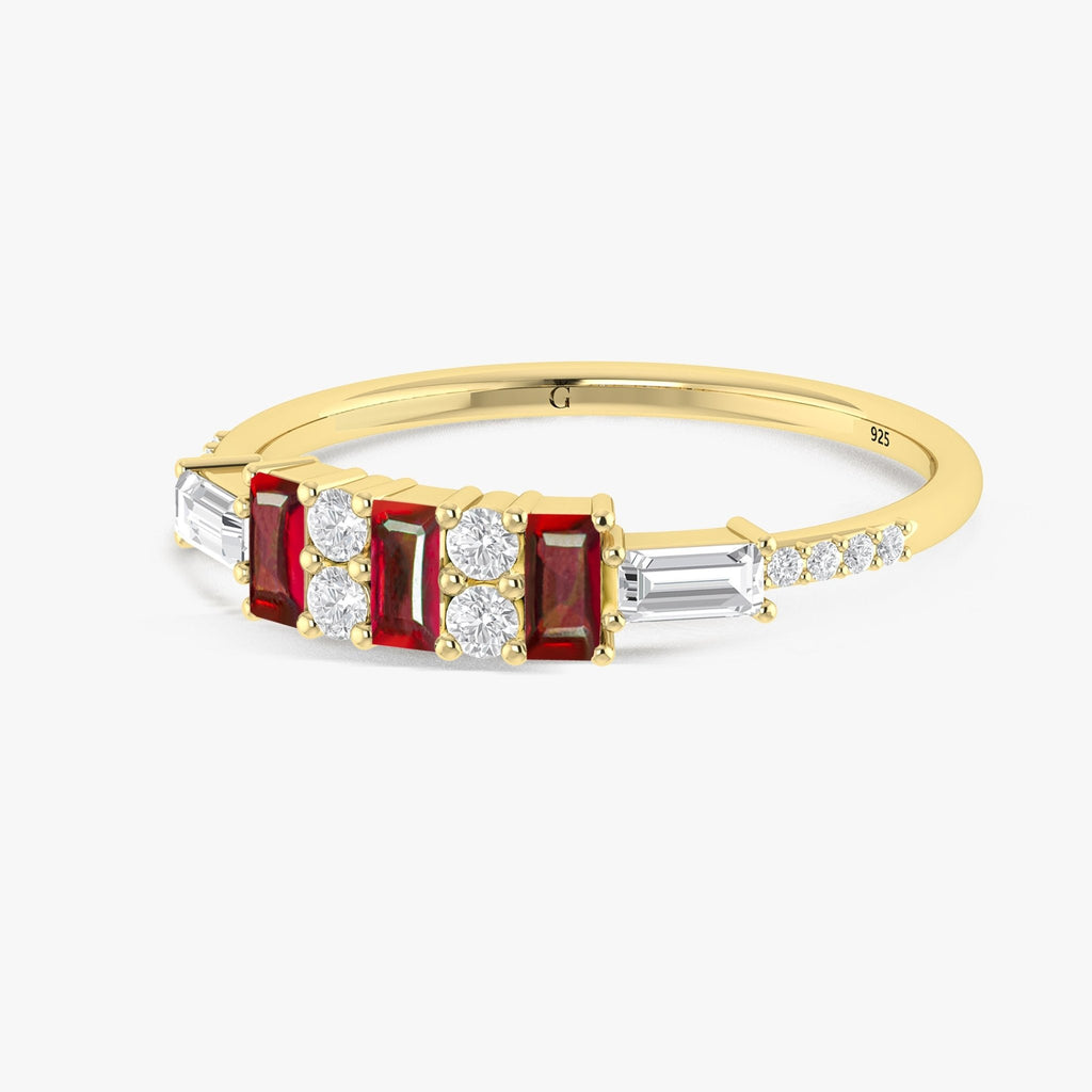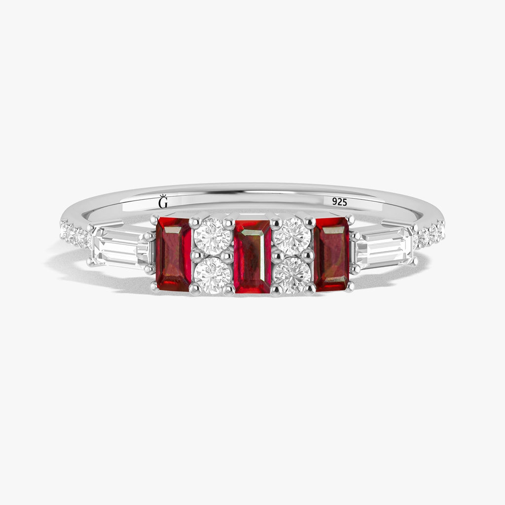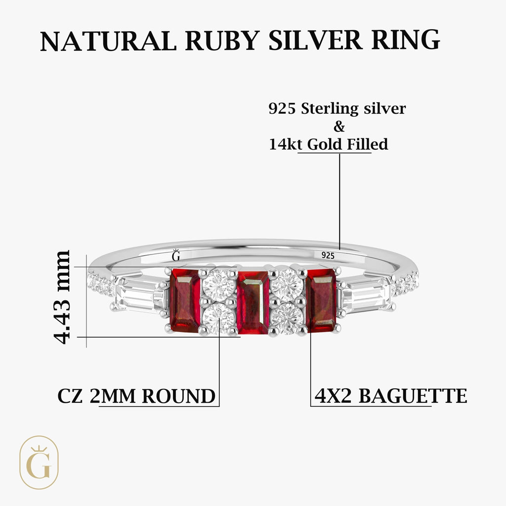 RubyNatural Ruby Ring, thoughtfully crafted for the modern woman who appreciates both beauty and symbolism. Featuring genuine 4x2 mm baguette-cut rubies, this ring boasts a total of 1.25 carats of natural brilliance. Each Ruby sparkles with a mesmerizing play of color, making it a captivating centerpiece for any jewelry lover. Expertly crafted in premium 925 sterling silver for an opulent finish, this ring promises durability, comfort, and enduring shine. Whether you're shopping for a birthday, milestone, or to express your love, this handcrafted statement ring is the perfect choice.