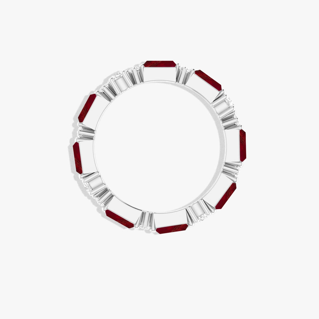 RubyNatural Ruby Eternity Wedding Band Ring, crafted for women who appreciate elegance and symbolism. This luxurious ring features eight baguette-cut natural Rubys, each 4x2 mm in size, meticulously set in a full eternity band design. With a total weight of 3.2 carats, these stunning gemstones dazzle with an enchanting play of color, creating a captivating and timeless look. Crafted from genuine 925 sterling silver and beautifully finished with yellow gold filled, this ring exudes sophistication and durability. The high-quality materials ensure lasting brilliance and shine, while the sleek, polished finish complements any outfit from casual daywear to evening elegance.