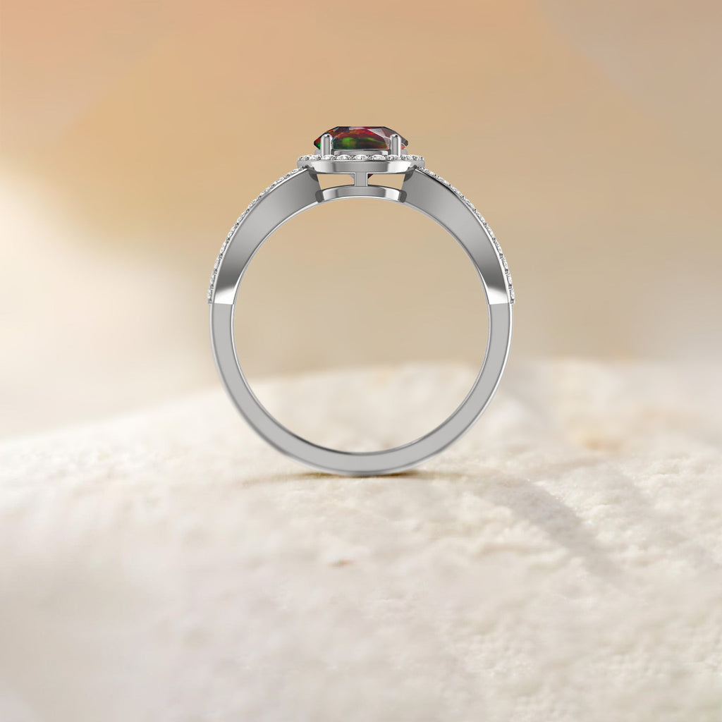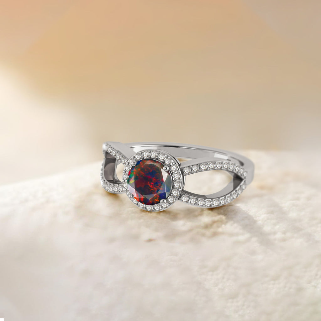 Black OpalNatural Black Opal Halo Ring featuring a 6mm round-cut black opal gemstone (approx. 1.0 carat), this captivating piece radiates a rich, multicolor brilliance unique to natural opals. The stone is set in premium 925 sterling silver, offering a luxurious yet durable design suitable for everyday wear or special occasions. Crafted in a unique , the ring embodies both contemporary fashion and timeless grace. Its sleek curves and striking centerpiece make it an unforgettable accessory for those who appreciate high-end artistry and personal expression in their jewelry.