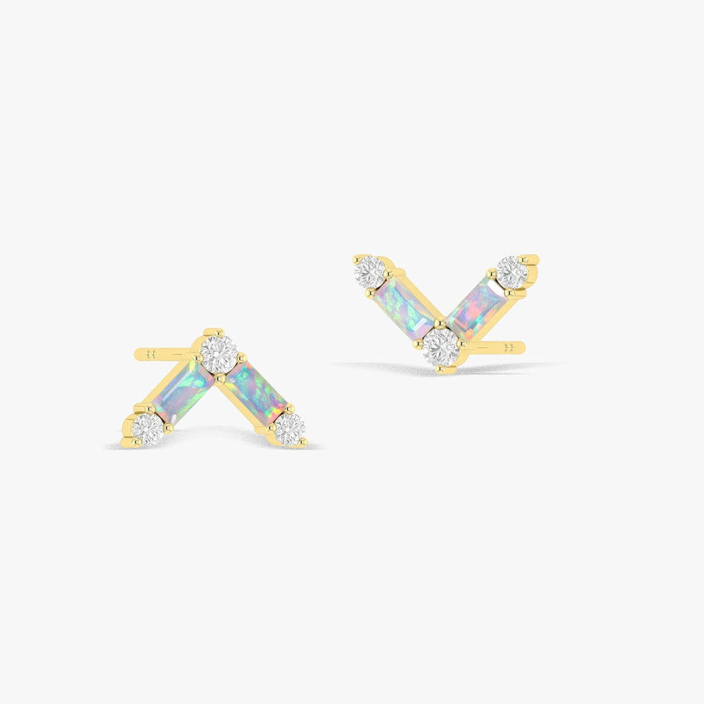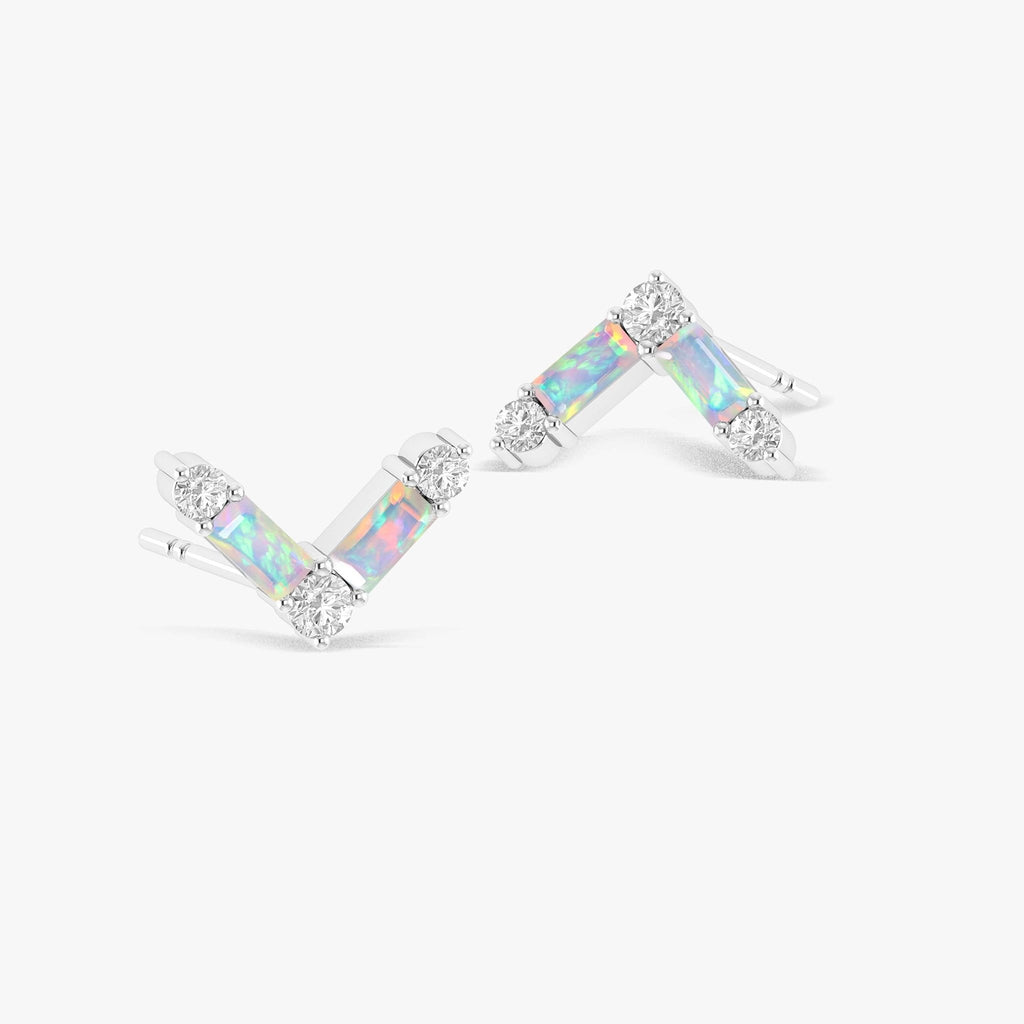 White OpalGOODSTONE JEWELS' 925 Sterling Silver Stud Earrings. Handcrafted with exquisite detail, these luxurious earrings feature natural opal baguette-cut gemstones, delicately set in durable sterling silver for a refined, high-end look. Inspired by the power of birthstones and the elegance of fine design, each earring sparkles with vibrant color and natural brilliance, making them a perfect gift for mothers, wives, girlfriends or a special treat for yourself. Whether you're celebrating a birthday, anniversary, or just want to express love and appreciation, these earrings deliver a meaningful and stylish statement. Measuring 13.80 x 8.90 mm and weighing just 3 grams, these earrings are lightweight enough for daily wear, while the secure push-back closure ensures a comfortable and reliable fit. Their unique 2.5 x 5 mm baguette-cut gemstones and 1 carat face make them stand out as a dazzling yet sophisticated accessory.