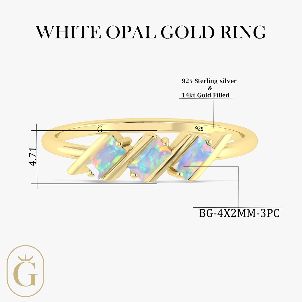 White OpalNatural White Opal 3-Stone Ring, beautifully handcrafted in 925 Sterling Silver. This luxurious ring features three 4x2mm baguette-cut genuine White Opals, each carefully faceted to enhance its mesmerizing play of color a signature trait of this rare birthstone. Whether you're shopping for a unique engagement ring, an anniversary surprise, or a promise ring for her, this design makes a heartfelt . The trio of natural White Opals symbolizes past, present, and future making it the perfect token of enduring love.