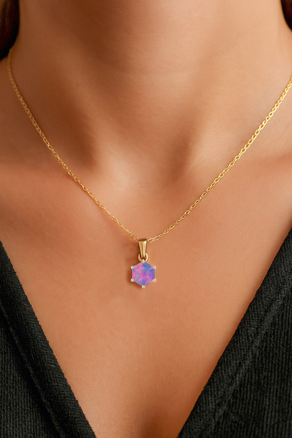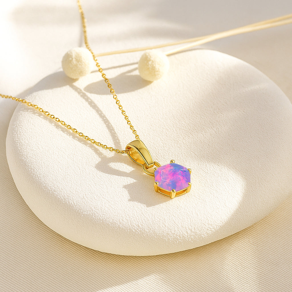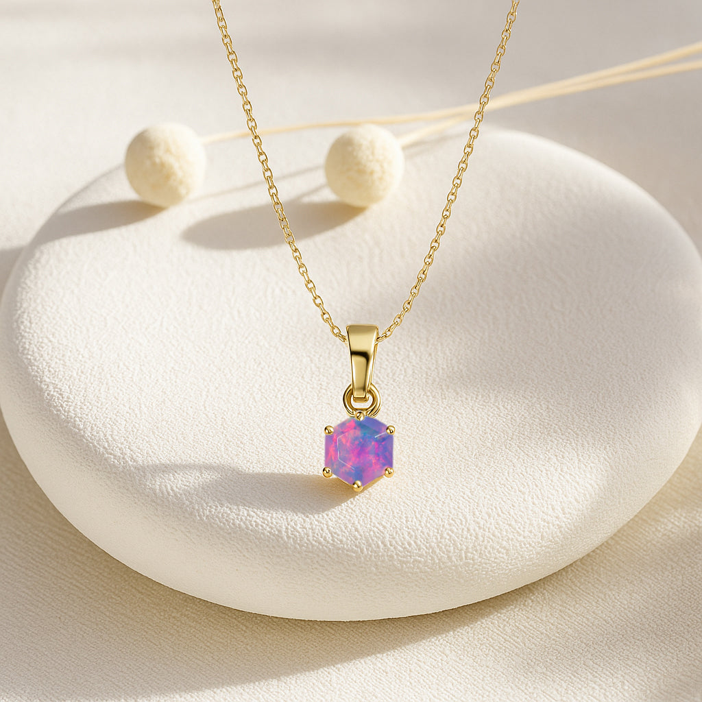 Lavender OpalAdd a touch of modern elegance with this Lavender Opal Hexagon Stone Pendant Necklace, crafted in fine 925 sterling silver. The design features a striking 7 mm hexagon-cut lavender opal weighing 1.20 carat, showcasing bold color and geometric charm. The pendant measures 17.50×7.00 mm and hangs gracefully from a 16″ + 2″ adjustable cable chain. With an approximate weight of 1.56 g, this lightweight yet luxurious piece is perfect for everyday wear or special occasions, offering timeless beauty in a unique shape.