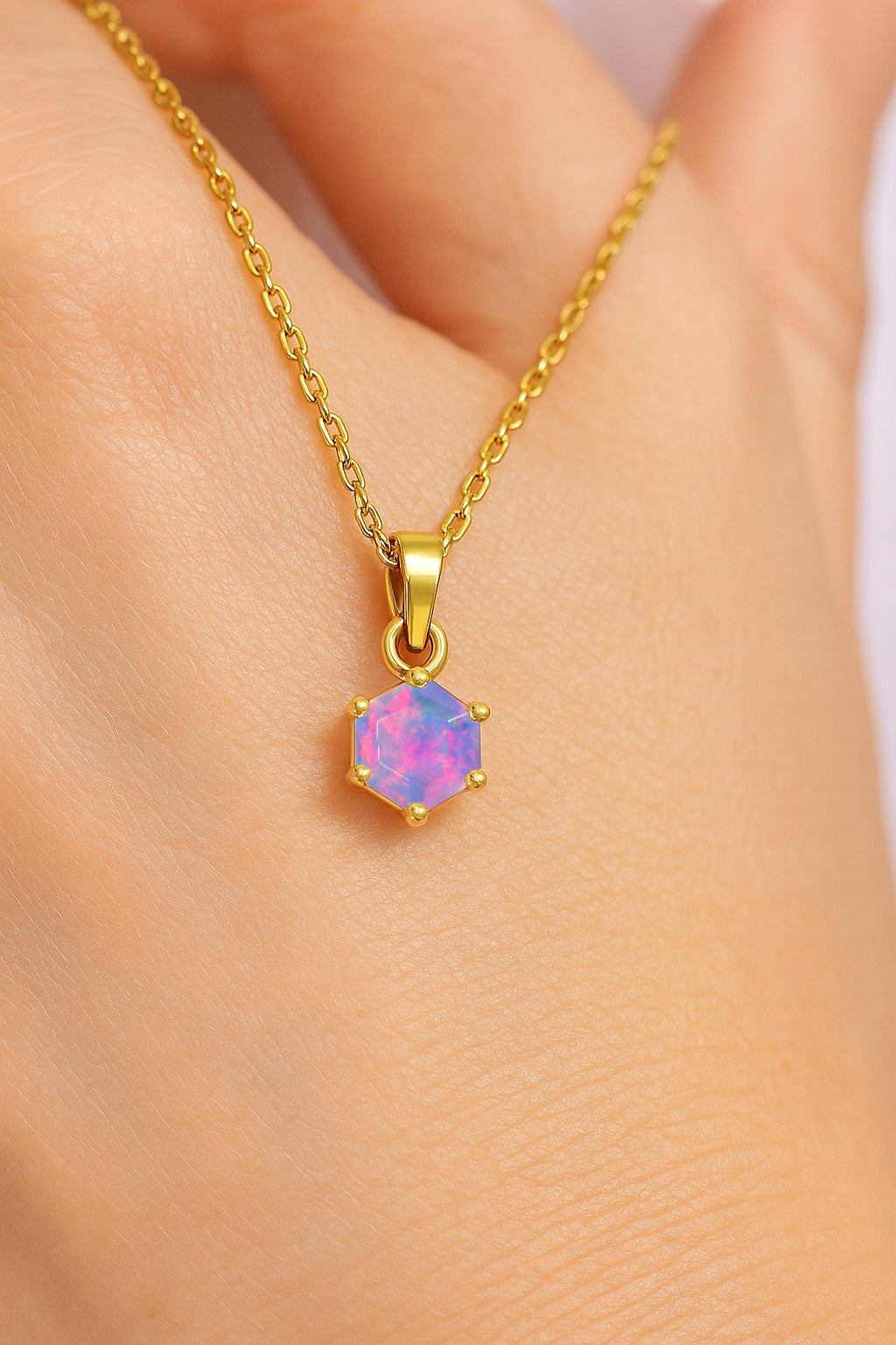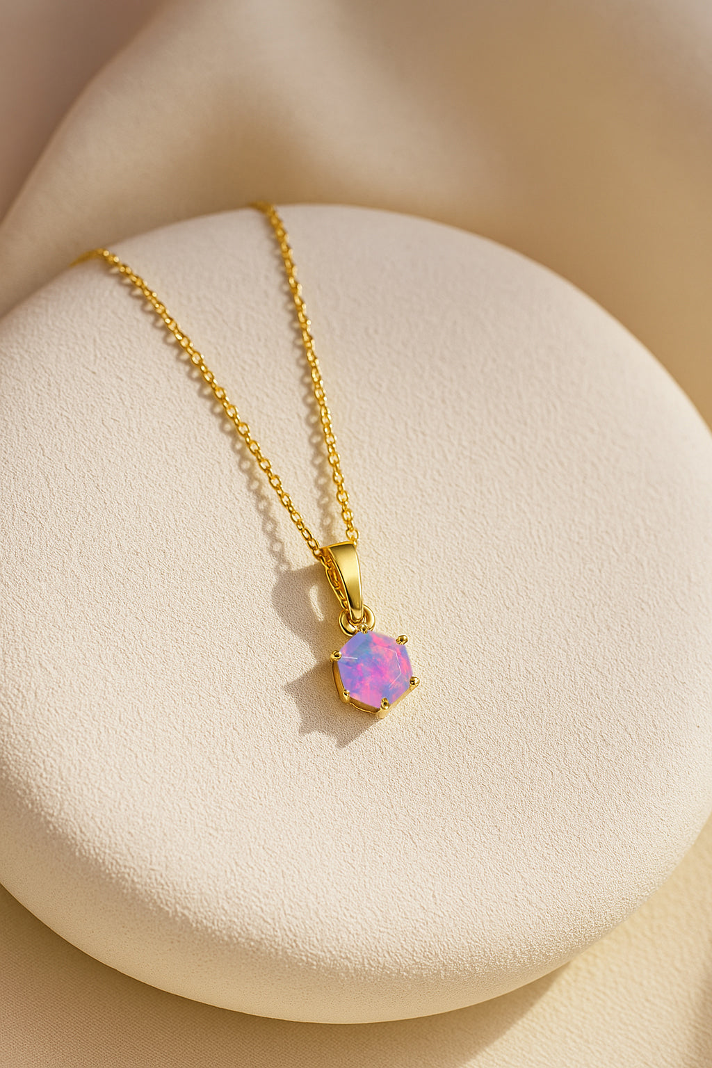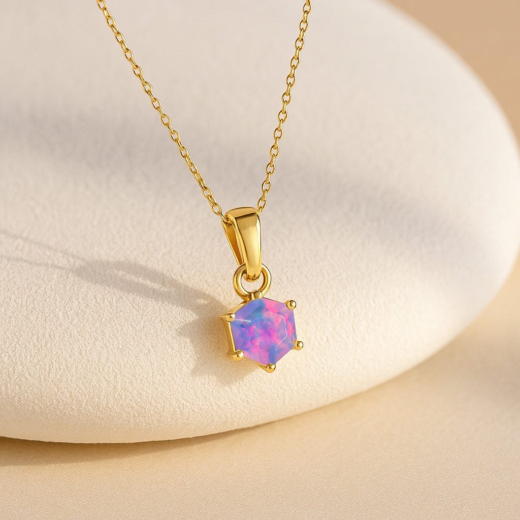 Lavender OpalAdd a touch of modern elegance with this Lavender Opal Hexagon Stone Pendant Necklace, crafted in fine 925 sterling silver. The design features a striking 7 mm hexagon-cut lavender opal weighing 1.20 carat, showcasing bold color and geometric charm. The pendant measures 17.50×7.00 mm and hangs gracefully from a 16″ + 2″ adjustable cable chain. With an approximate weight of 1.56 g, this lightweight yet luxurious piece is perfect for everyday wear or special occasions, offering timeless beauty in a unique shape.