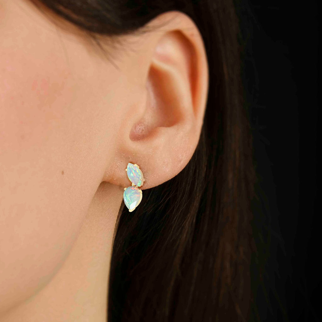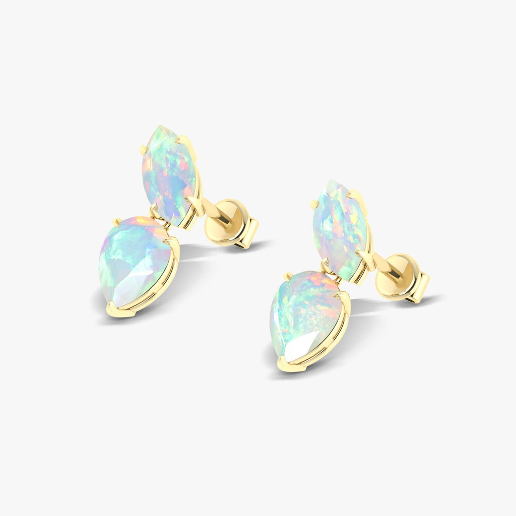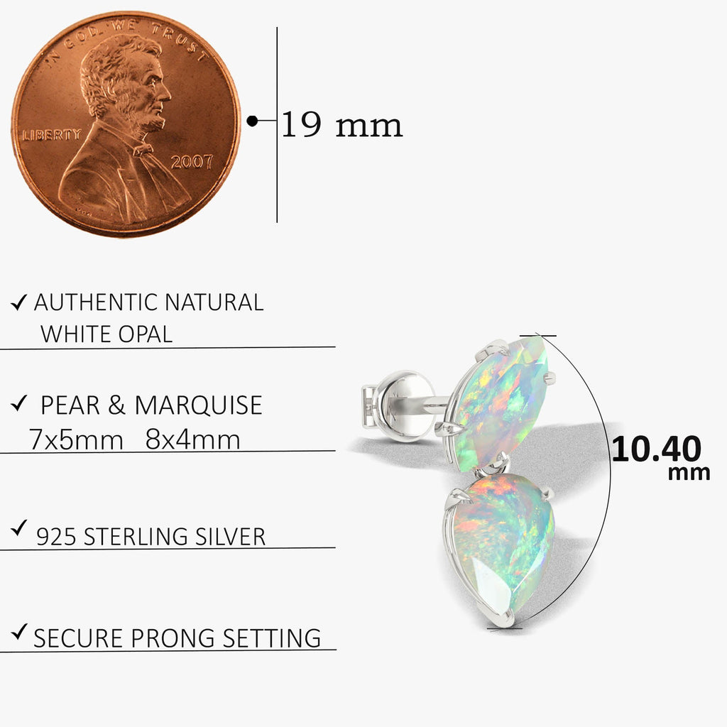 White OpalGOODSTONE JEWELS Natural Gemstone Stud Earrings, featuring a captivating gemstone Opal. These stunning earrings are masterfully crafted from 925 sterling silver making them perfect accessory for any occasion. Each stud showcases a beautiful 8x4 mm marquise and 7x5 mm pear-shaped gemstone, with a total stone weight of 2.4 carats, creating a refined yet radiant design that glimmers with every movement. Measuring 14.5 x 5.30 mm and weighing 2.10 grams, they offer a lightweight and comfortable fit with a secure push-back closure ideal for day-to-night wear. These earrings are more than just accessories, they’re meaningful birthstone jewelry gifts that celebrate love, beauty, and timeless style.