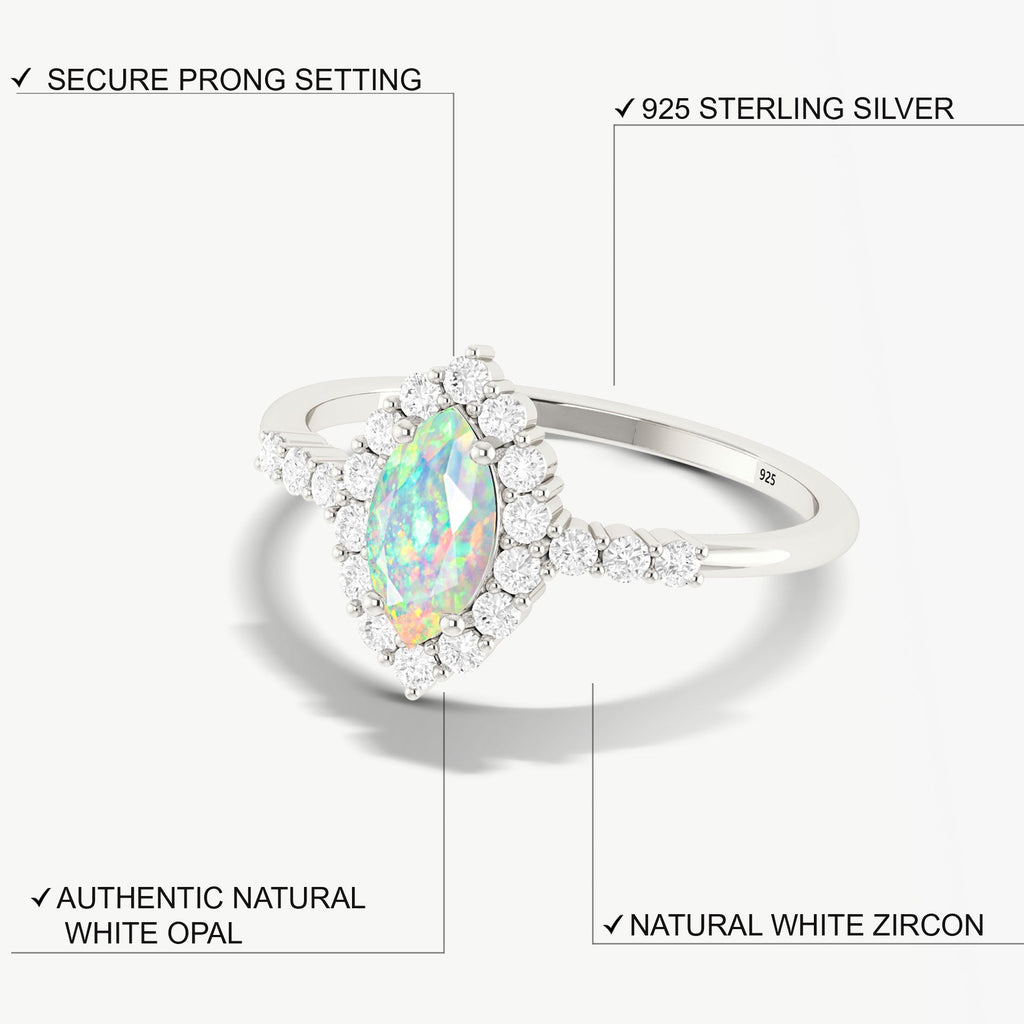 White OpalThis stunning Natural White Opal Halo Wedding Ring. Featuring a rare 8x4 mm marquise-cut White opal, the center stone is beautifully set in a radiant halo design that enhances its brilliance and depth. Crafted from solid 925 sterling silver, this exquisite ring combines premium craftsmanship with a luxurious appearance. The halo design adds vintage charm while maintaining a modern, graceful style that suits any occasion, from daily wear to weddings or special events. The hypoallergenic silver band ensures long-lasting comfort and shine, making it ideal for sensitive skin.